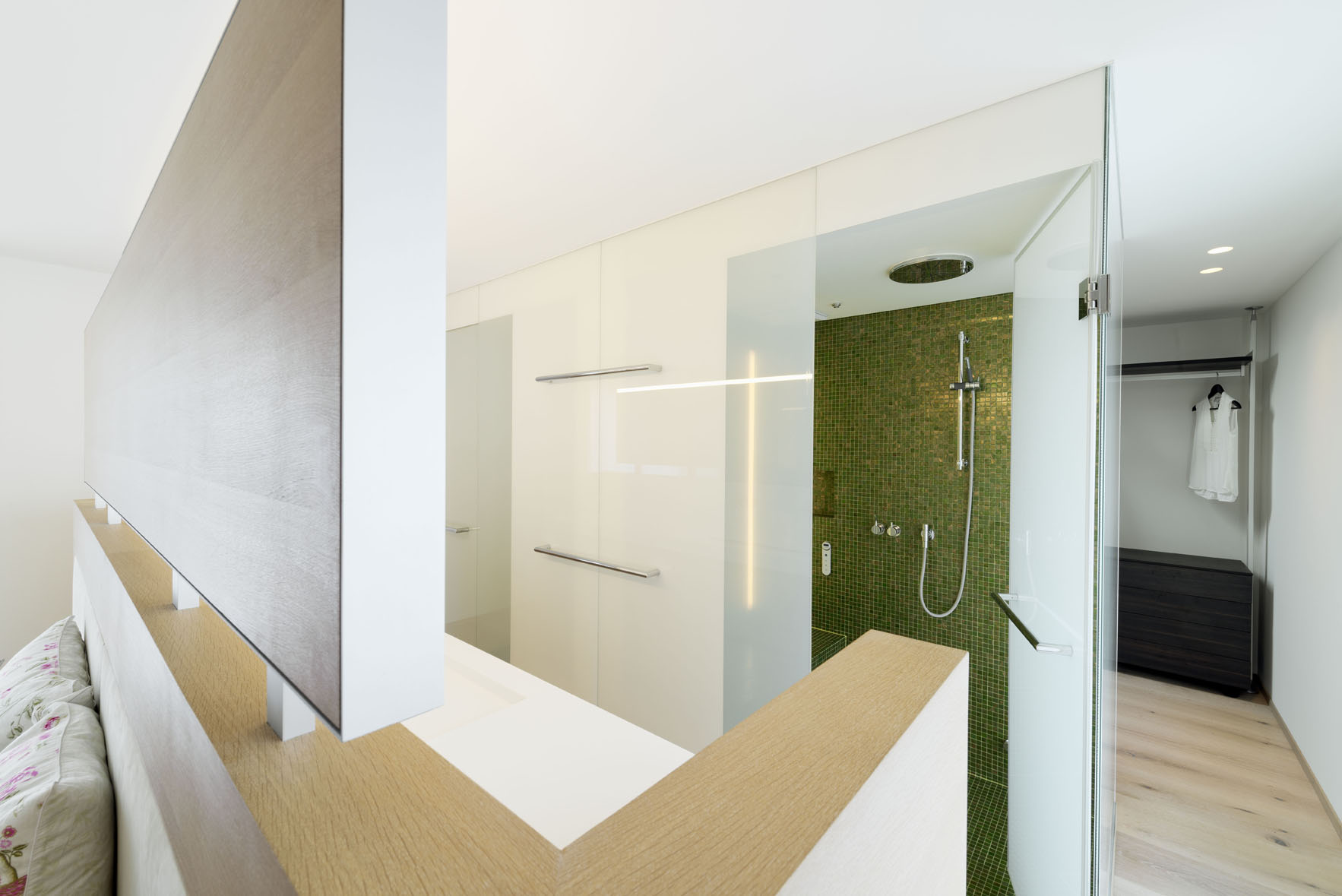 Natürlich im Gefühl, aber durchdacht bis ins kleinste Detail: Eine bündig integrierte Nische dient als Abstellfläche für Shampoo, Seife und Co. Eine satinierte Glasfront sorgt dafür, dass die hektische Welt draussen bleibt und nur noch die Entspannung zählt!