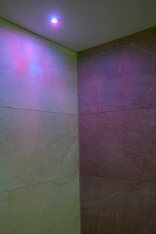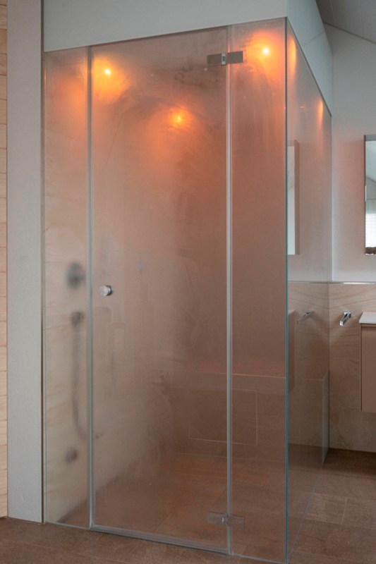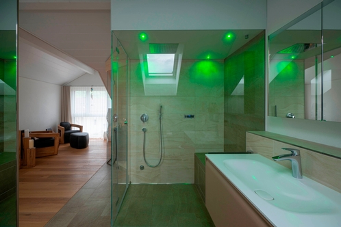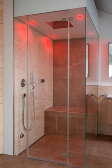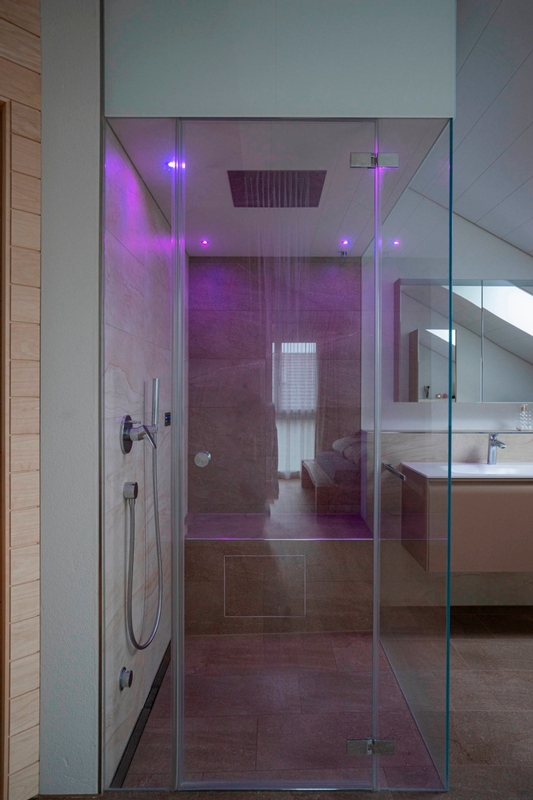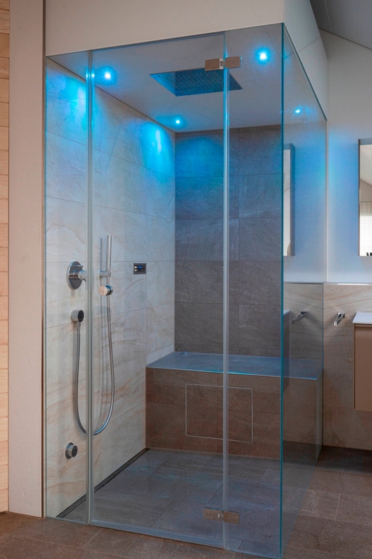 Direkt daneben, die massgeschneiderte Dampfdusche, mit grosszügigem Dampfsitz, der gleichzeitig als „Versteck“ für die hochwertige Dampftechnik dient. Vom Boden bis zu den Wänden mit Natursteinfliesen veredelt und mit filigranem Farblicht ausgestattet. Dank des millimetergenauen Glasverlaufs liegt die Scheibe perfekt an. Sichtbare Wandhalterungen oder einen Rahmen sucht man hier vergebens. Die Pendeltür lässt sich nach innen wie aussen schwenken. Eine, flächenbündig ins Dach integrierte Regenbrause komplettiert das (Dampf-) Duscherlebnis. Das tropfarme, massgefertigte Dach bildet den harmonischen Abschluss für ein exklusives Raum- und Duscherlebnis.