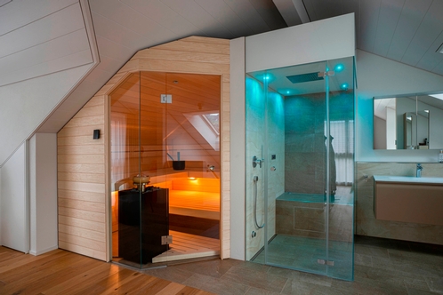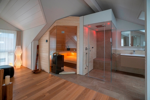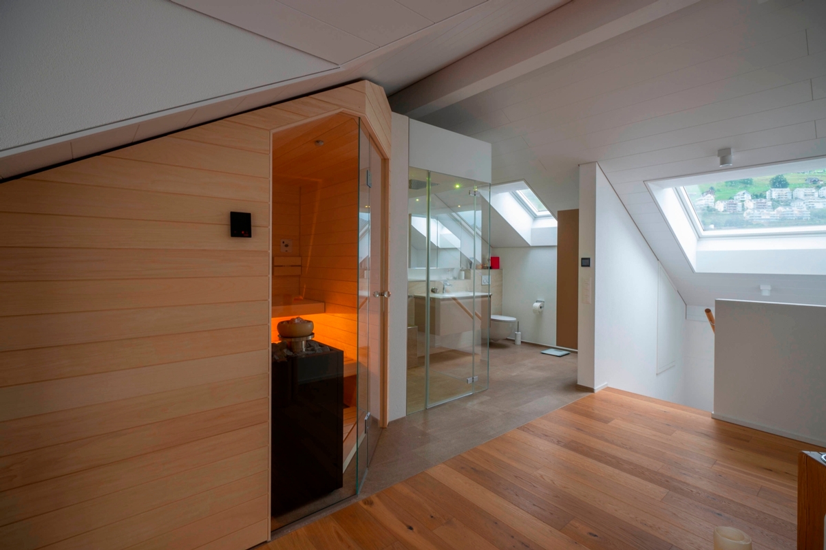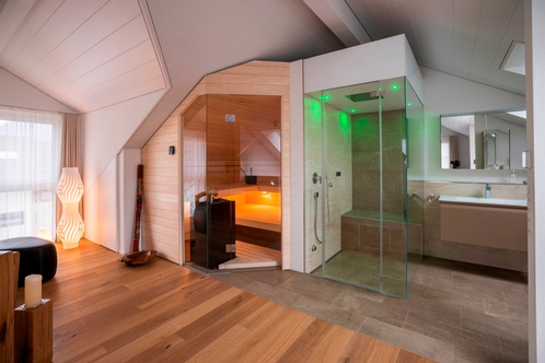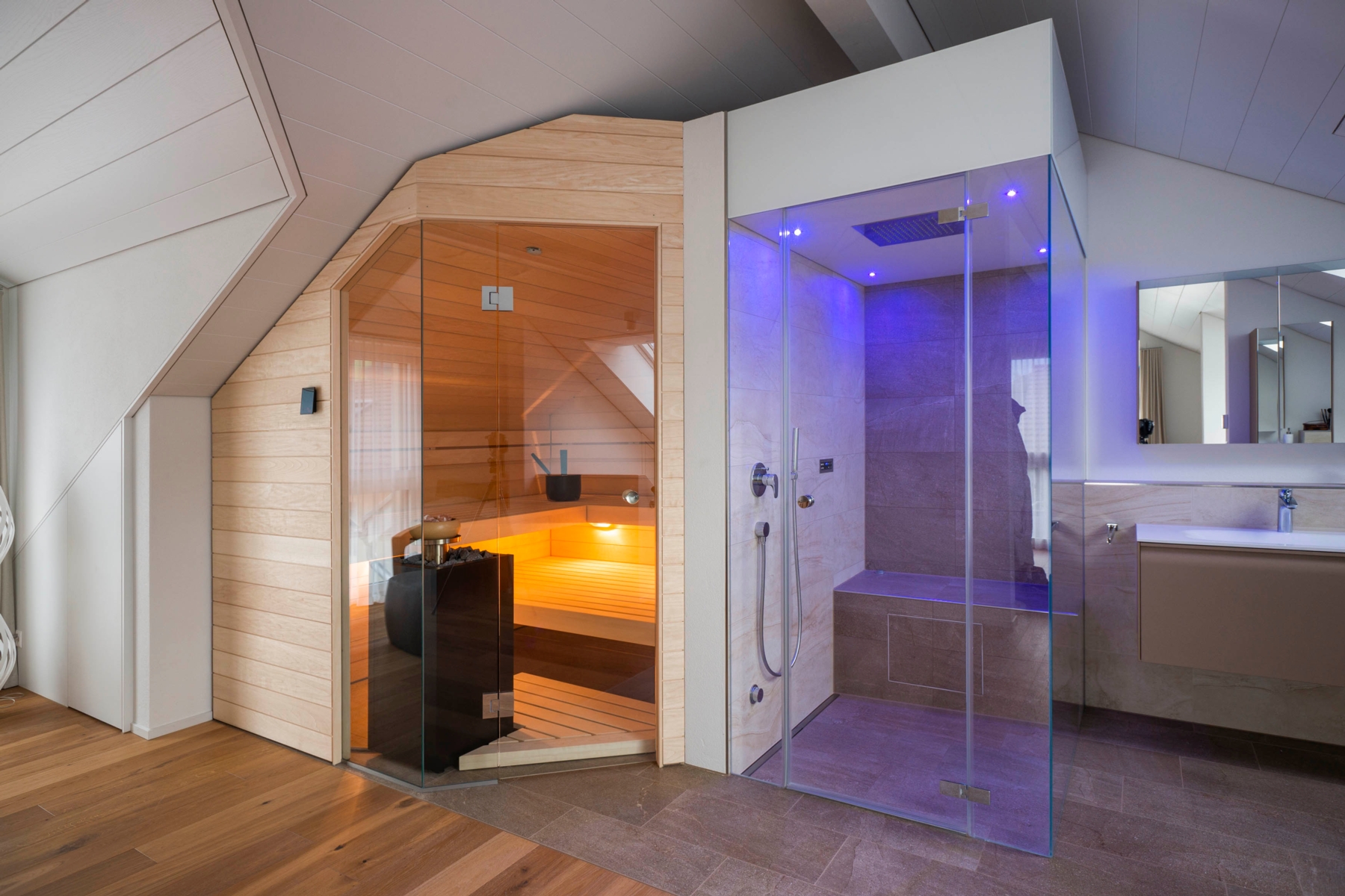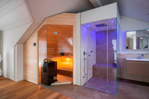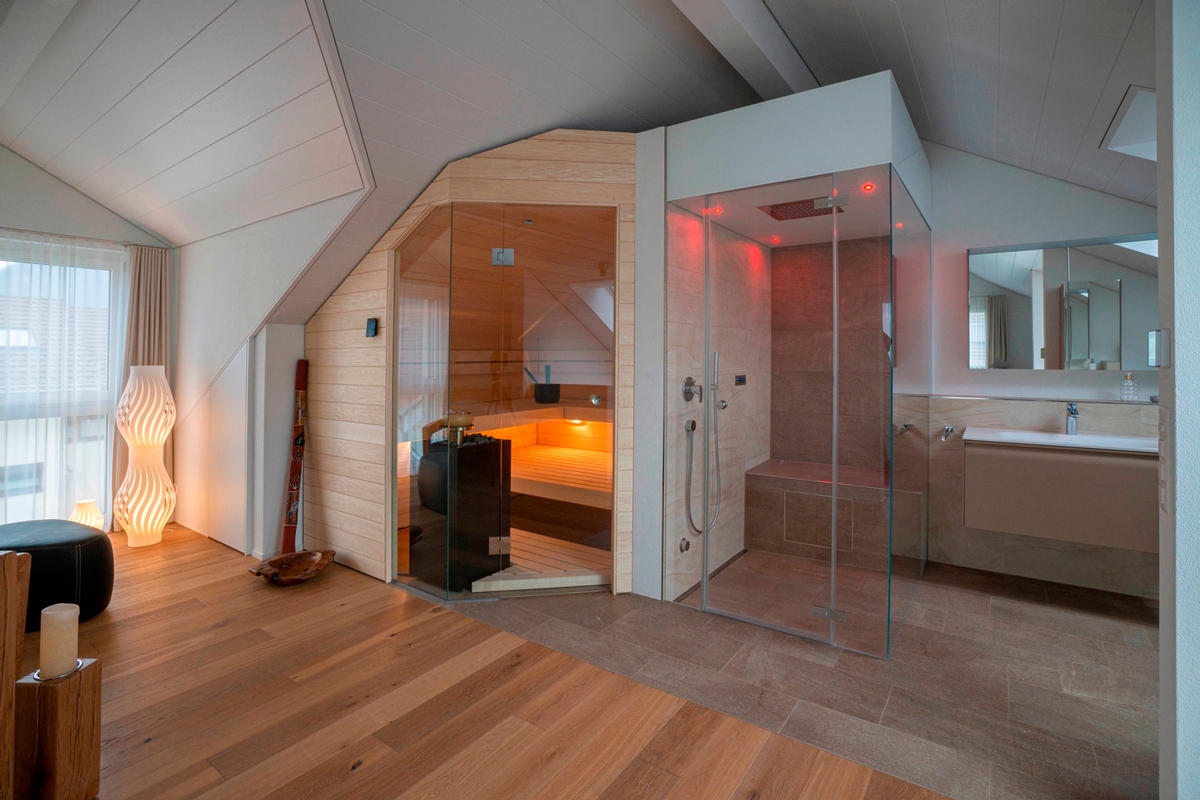 Ein perfektes Beispiel ist das Wellness-Bad in einem Dachgeschoss im Kanton Nidwalden. Die Bauherren des neu erbauten Traumhauses, eine fünfköpfige Familie, wollten eine Oase der Entspannung schaffen. Eine Aufgabe, die das Team von Sauna World übernahm, mit grossem Erfolg. Trotz Dachschrägen sollte eine offene, wohnliche Atmosphäre entstehen, in der sich Sauna und Dampfdusche perfekt einfügen. „Wichtig bei jedem Auftrag ist es, die Wünsche und Vorstellung der Bauherren im grossen wie kleinen in das Gesamtkonzept miteinzubeziehen und während des Umsetzungsprozesses weiter zu optimieren, in einem offenen, ehrlichen Vertrauensverhältnis zu den Kunden“, erklärt Sauna World.