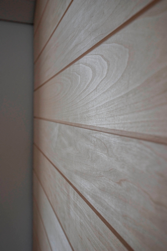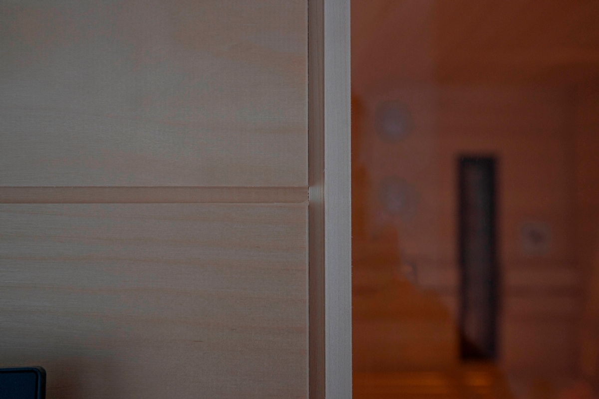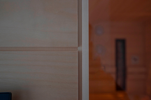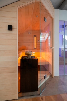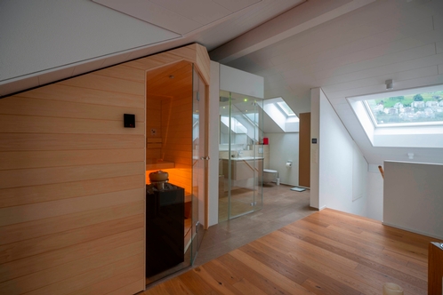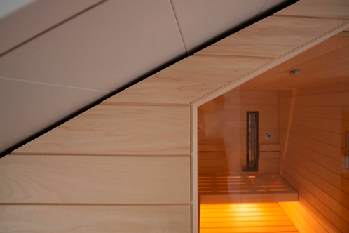 Die 2,40 x 2,40 m grosse Sauna wurde komplett in die Dachschräge integriert. Eine abgeschrägte Front mit Teilglas- und Holzverkleidung innen wie aussen. Extra breites Espenholz im Innenbereich bietet besonderen Komfort. Ein doppelwandiger Saunaofen inschwarz-mattem, kubischem Design mit 50 kg Steinen vermittelt jedes Mal ein echtes Saunaerlebnis. Zusätzlich wurden Infrarotstrahler mit intensiver und punktueller Tiefenwärme gezielt für die Problembereiche am Rücken und den Gelenken eingebaut. Doppelte Entspannung für Körper und Geist.