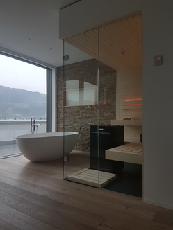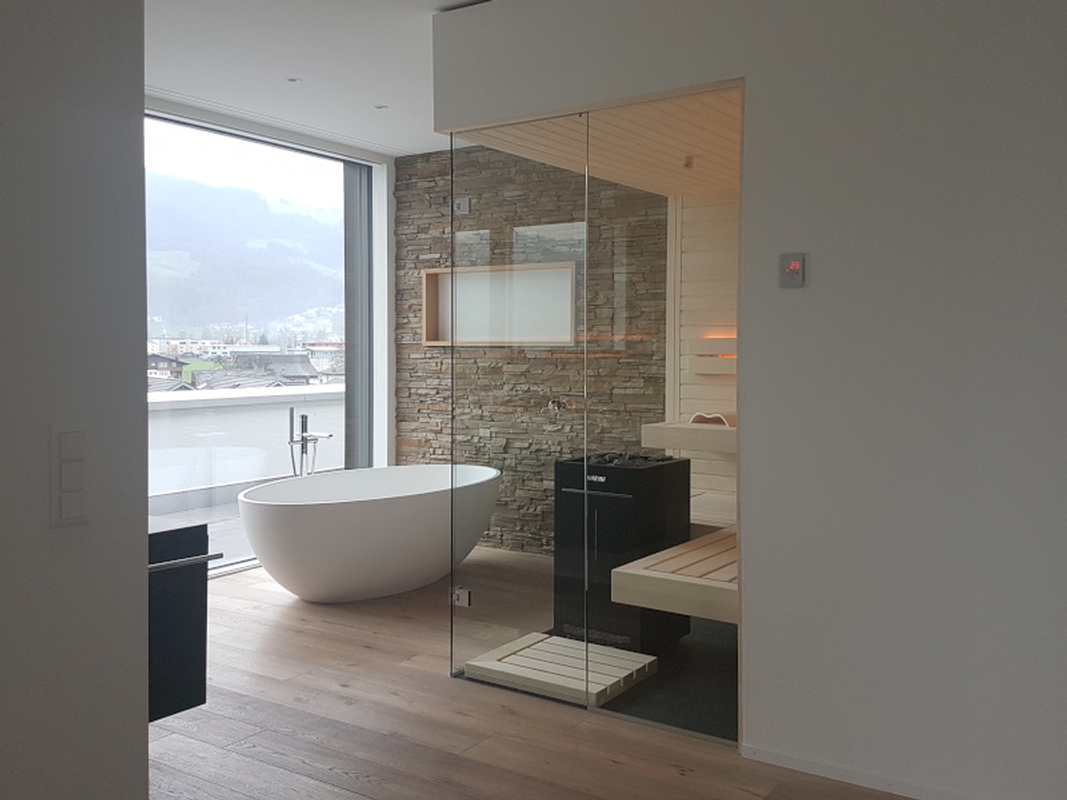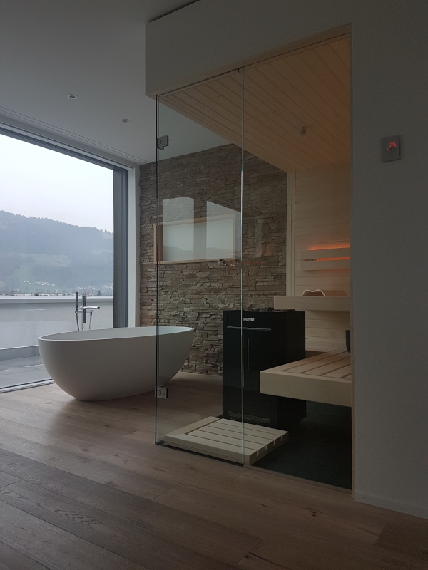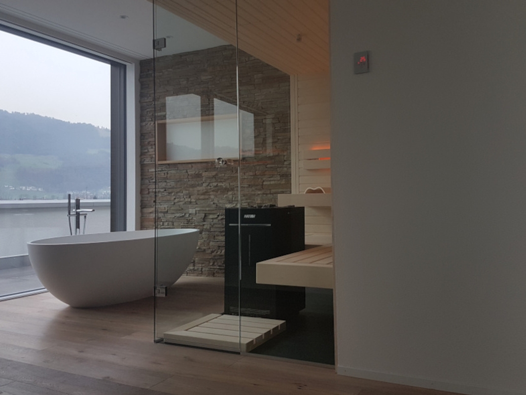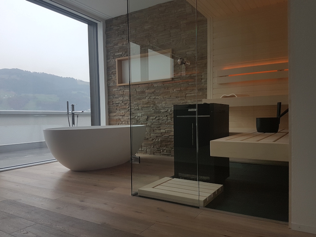 Direkt vom Schlafzimmer dieser stilvollen Attikawohnung im Kanton Schwyz betritt man das offen gestaltete Wellness-Badezimmer. Das Herzstück: eine stilvolle Sauna mit atemberaubendem Blick auf die umliegenden Berge. Ergänzt wird das Erlebnis durch eine freistehende, ovale Badewanne – perfekt platziert vor der Glasfront.