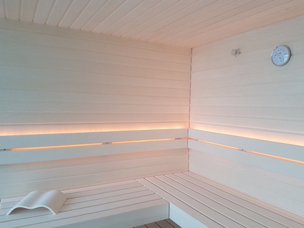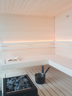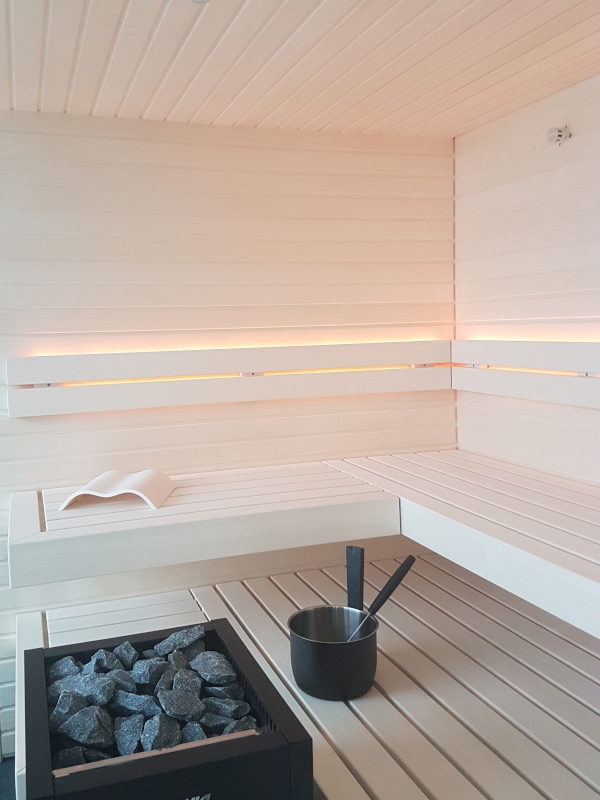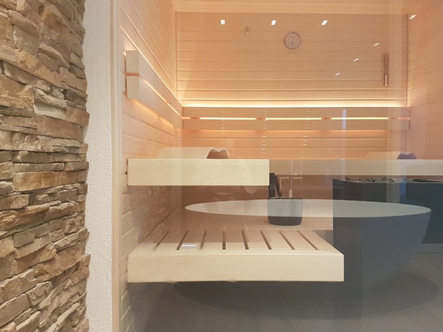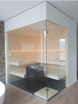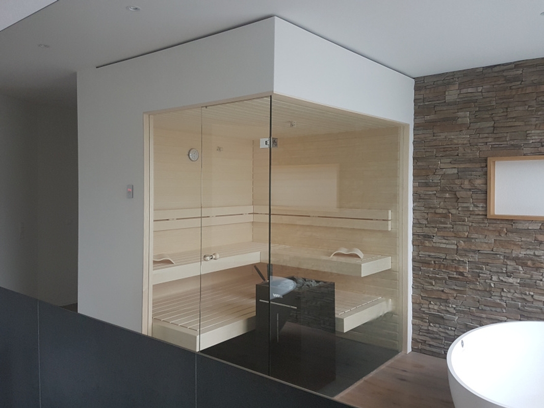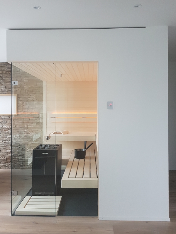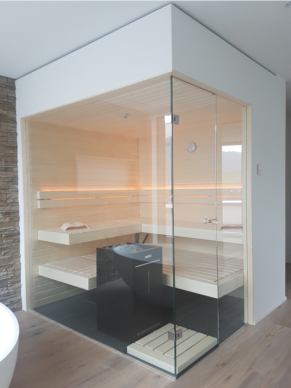 Die Sauna selbst ist aus horizontal verlegtem Espenholz gefertigt und vermittelt durch ihre helle Optik eine warme, einladende Atmosphäre. Die grosszügige Glasfläche öffnet den Blick sowohl in die Sauna, als auch heraus und vermittelt ein Gefühl für Weite und Leichtigkeit. Die elegant gestalteten Liegen runden das Design ab. Welche durch eine ausgeklügelte Spezialkonstruktion zu schweben scheinen.