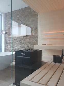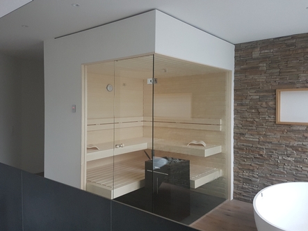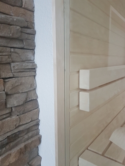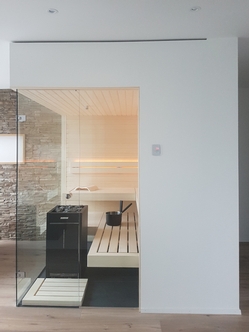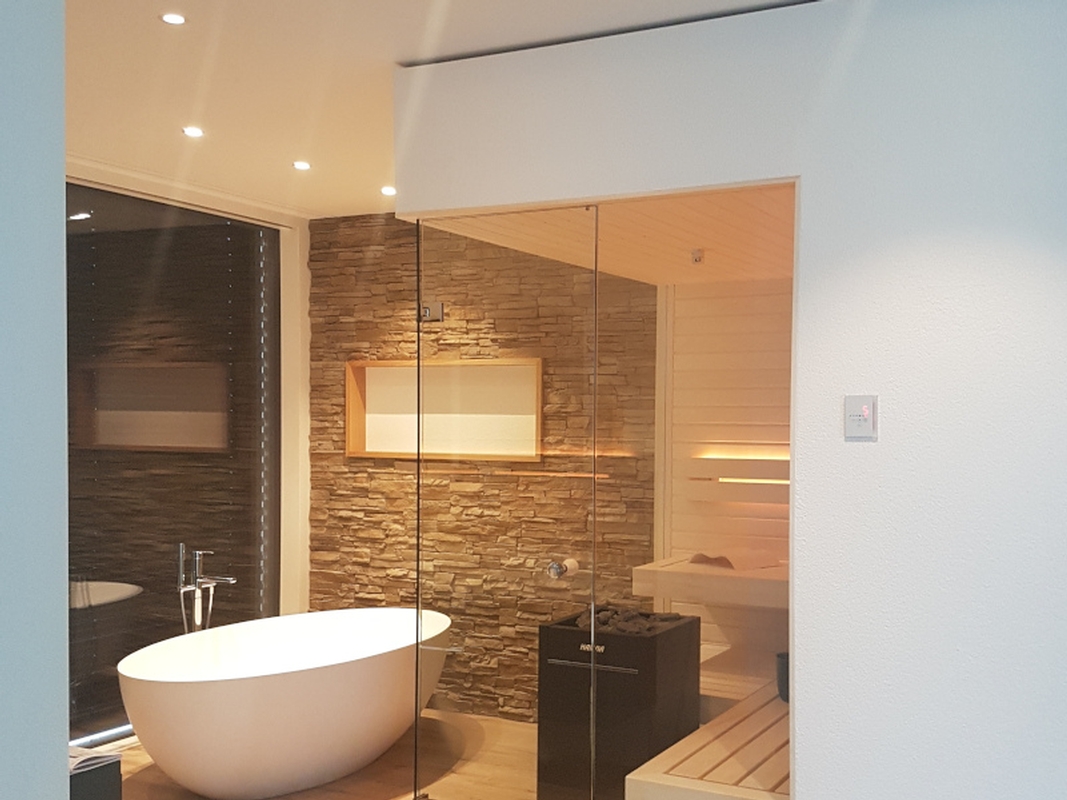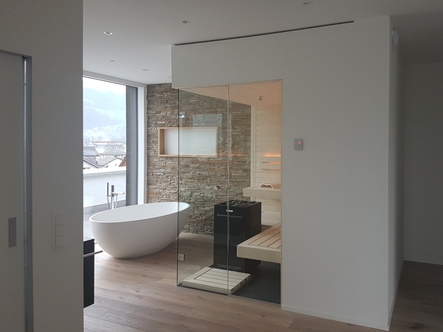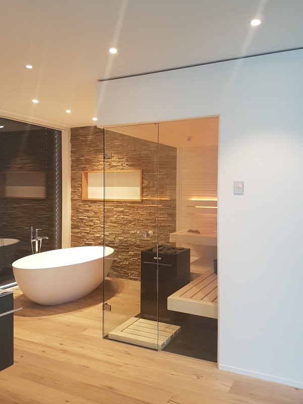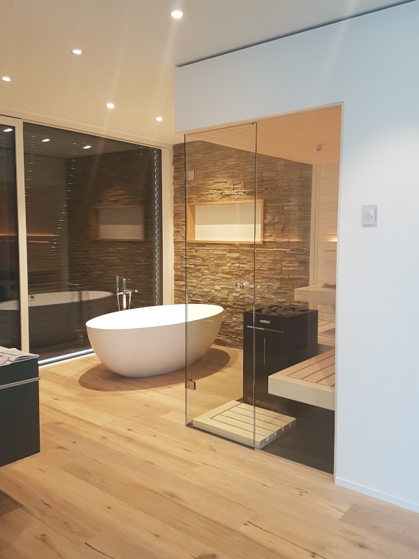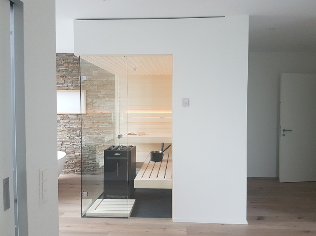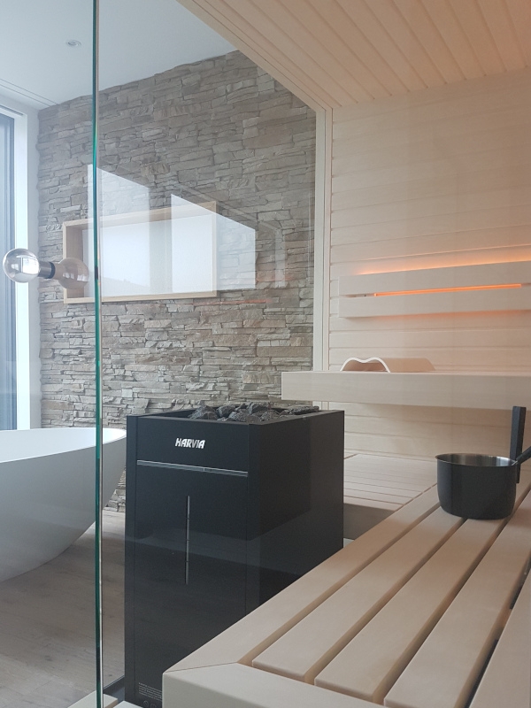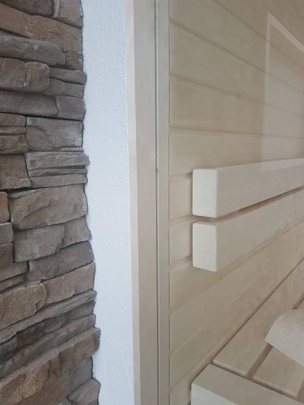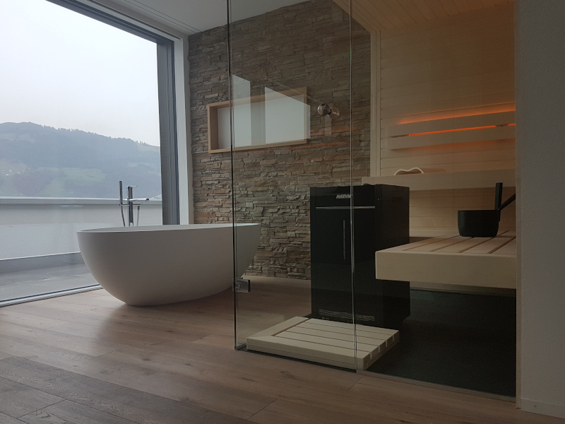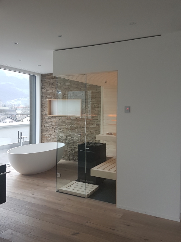 Auch von aussen fügt sich die Sauna harmonisch in das Gesamtbild ein: Mit demselben Putz wie die übrigen Wände versehen, wirkt sie wie ein integrierter Bestandteil des Badezimmers. Die angrenzende Steinwand setzt einen stilvollen Akzent und vervollständigt das Konzept.