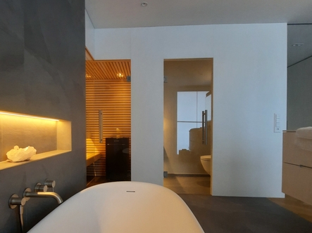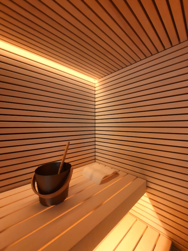 Aus verschiedenen Varianten wurde die nun realisierte Lösung gewählt und umgesetzt. Die Herausforderung war, die Ästhetik, die Materialisierung, Funktionalität der Sauna sowie die Anschlüsse und Übergänge auf die angrenzenden Bauteile, unter einen Hut zu bringen.
