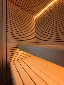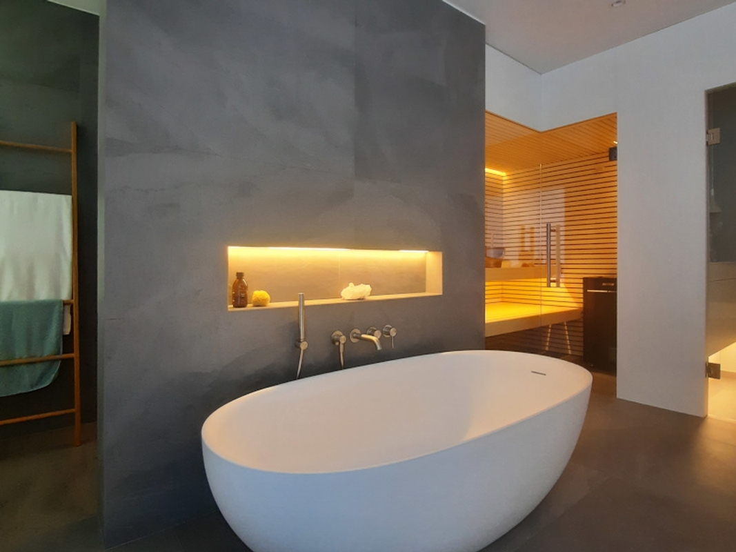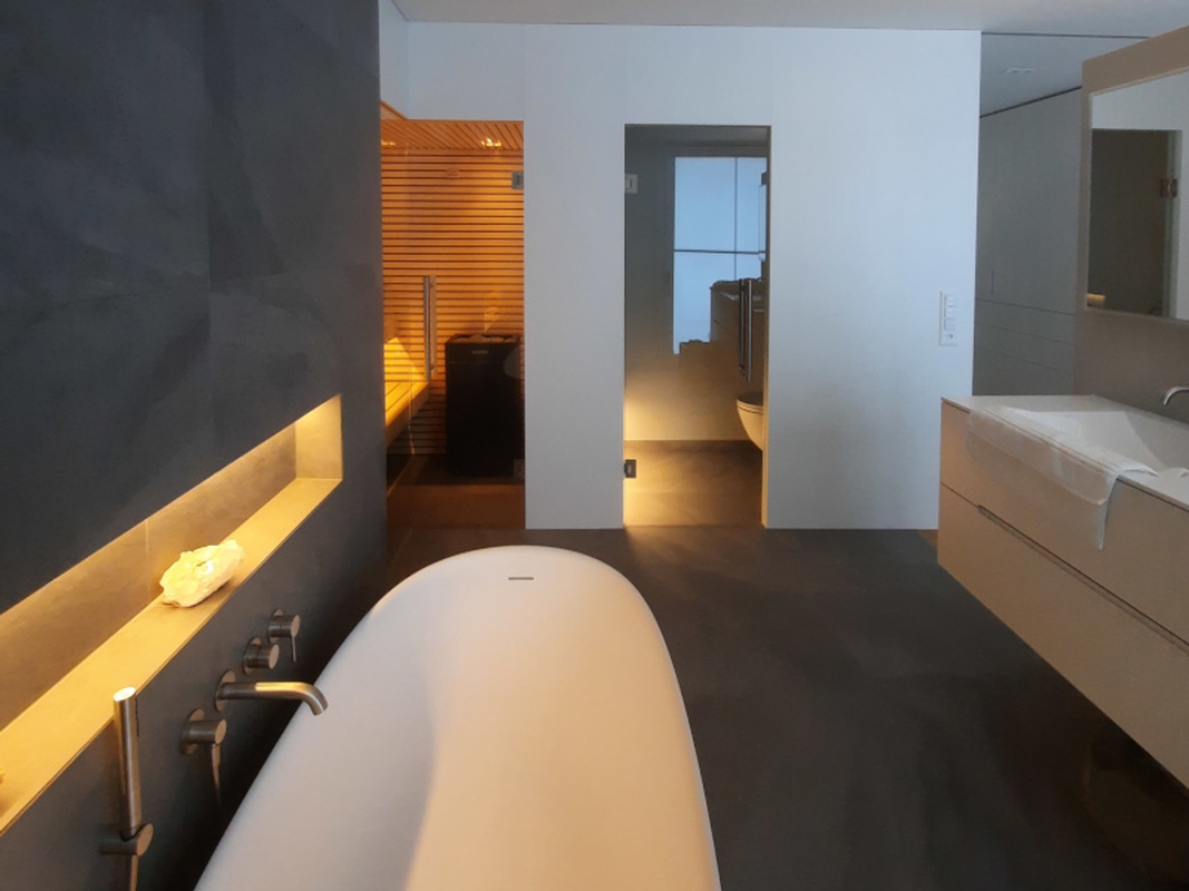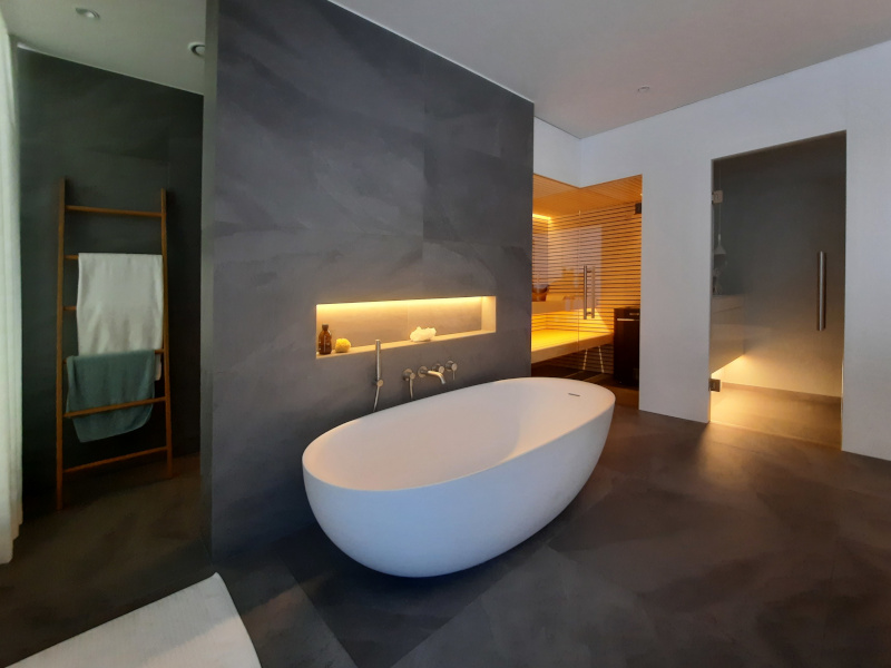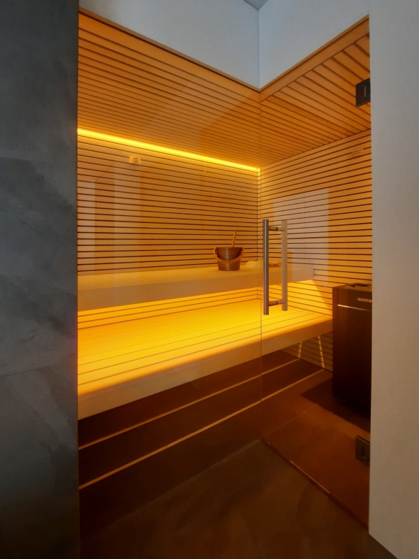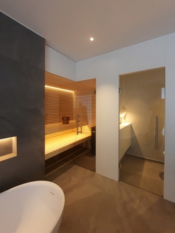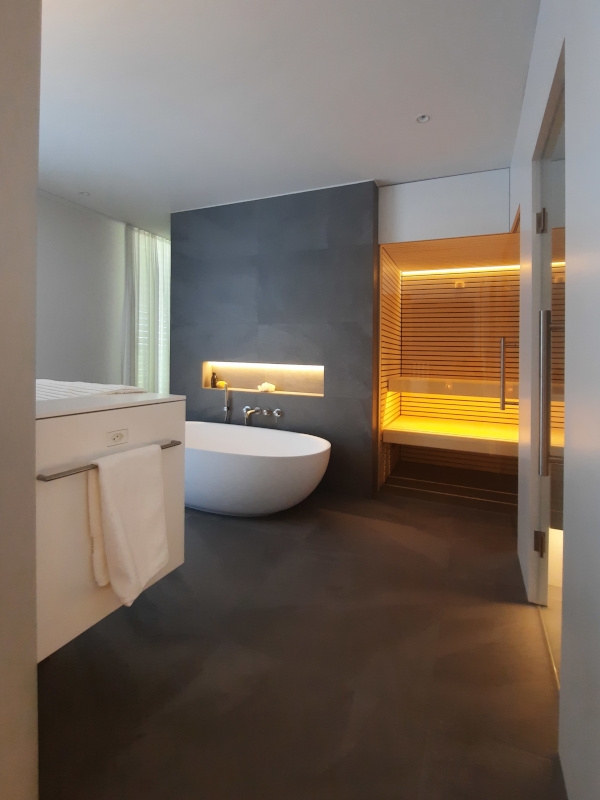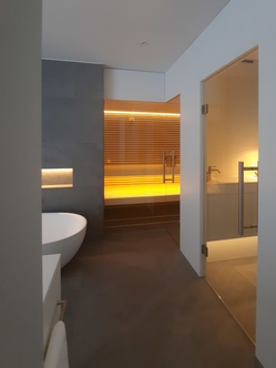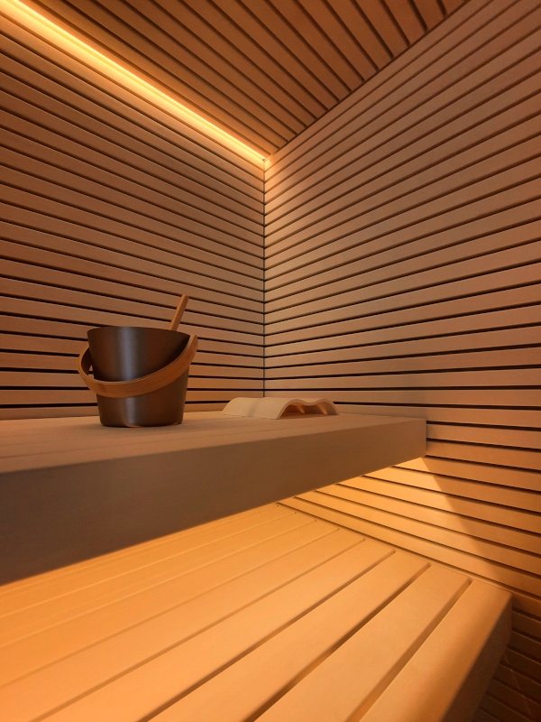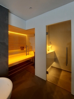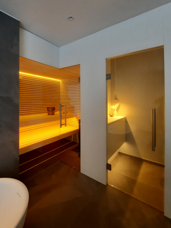 Die Sauna im Badezimmer, integriert in die Raumgestaltung, dies war der Wunsch der Bauherrschaft bei diesem Projekt. Gemeinsam wurde die Materialisierung definiert und nach Möglichkeiten gesucht, die Sauna in der bereits bestehenden Planung der Wohnung zu integrieren.