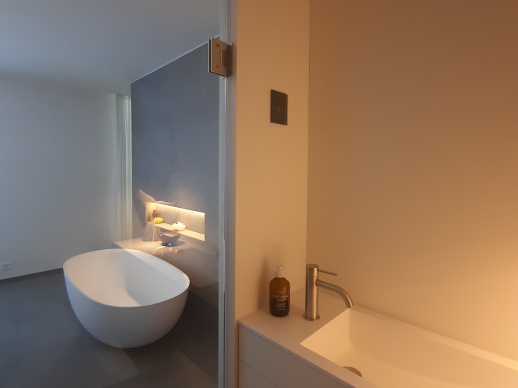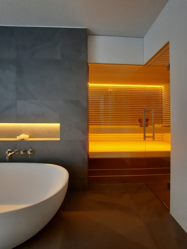 Die verschiedenen Saunabeleuchtungen, in der Decke, unter der Saunabank und über dem Saunaofen, werden über das Haussystem gesteuert. Die Bauherrschaft kann so das gesamte Badezimmer inklusive der Sauna in verschiedene Lichtstimmungen tauchen.