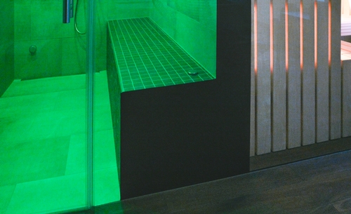 Die angrenzende Dampfdusche besticht durch ihre grossformatigen Fliesen in edlem Grau. Zum Schutz der Intimsphäre wurde das Glas auf einer Seite mit einem Verlauf sandgestrahlt. Für das „normale“ Duschen wird weisses Funktionslicht und für erholsame Dampfsitzungen Farblicht aktiviert. Eine grosse Regendusche wurde flächenbündig in das Dach aus Mineralwerkstoff eingebaut, ebenso wie spezielle Lautsprecher. Sprühnebeldüsen in der Decke sorgen für gezielte Abkühlung und die integrierte Sitzheizung im Dampfsitz, der die Dampftechnik unsichtbar versteckt hält, lädt zum komfortablen Verweilen ein.