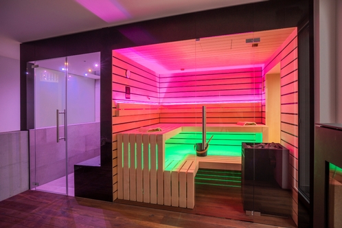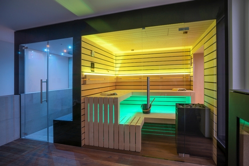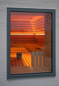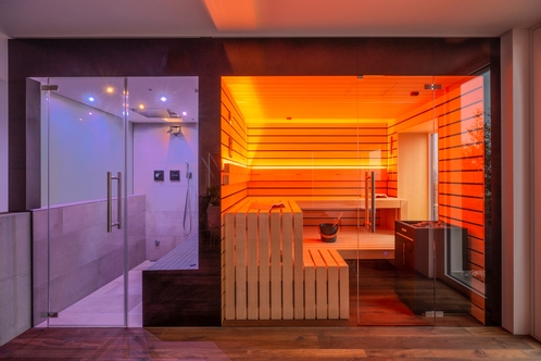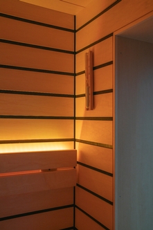 Die Sauna besticht durch hochwertiges Saunaholz, Täfer im breiten scharfkantigen Espe Design mit dunkler Feder. Grosse Fensterfronten, einmal mit Blick in die Berge und einmal zum Bad hin, lassen die Natur in die Sauna und öffnen den Raum optisch nach innen wie aussen. LED-Farblichter in den Rückenlehnen und der unteren Liege schaffen eine besonders heimelige Atmosphäre. Auch die Liegen bestechen durch hohe Individualität: Die oberen Liegen sind mit 70 cm extrabreit für bequemes Liegen. Die untere Liege verläuft bis zur Rückwand, wodurch die Sauna offener und grossflächiger wirkt. Im Fokus ein echter finnischer Saunaofen, der auch den Bi-O-Saunabetrieb erlaubt. Die Lieblingsmusik über Bluetooth sorgt für wahres Entspannungsfeeling.