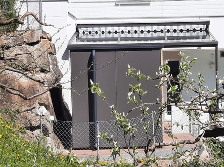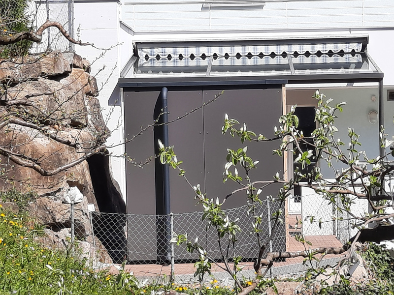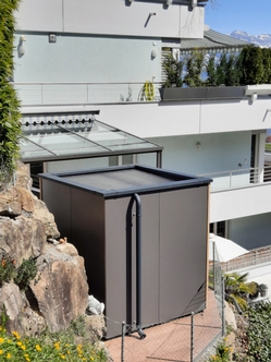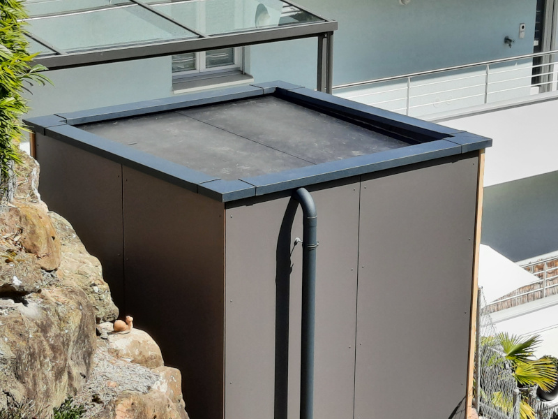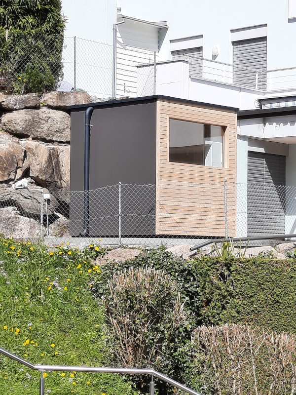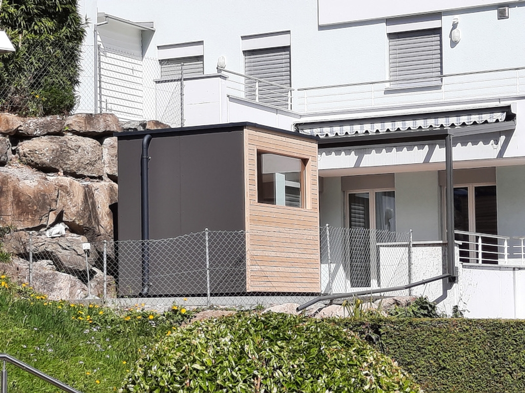 Die Fassadenverkleidung der Aussensauna in HPL- Platten, wie auch die Blechteile wurden farblich an die angrenzende Pergola angepasst.