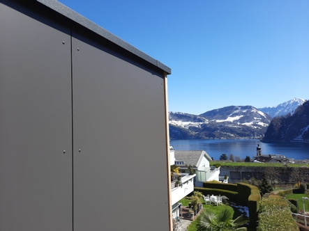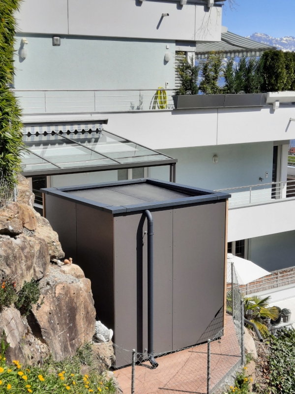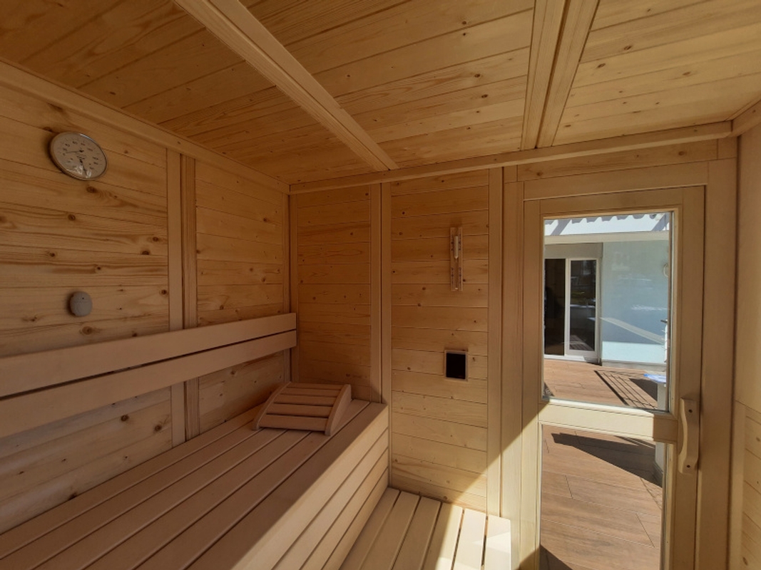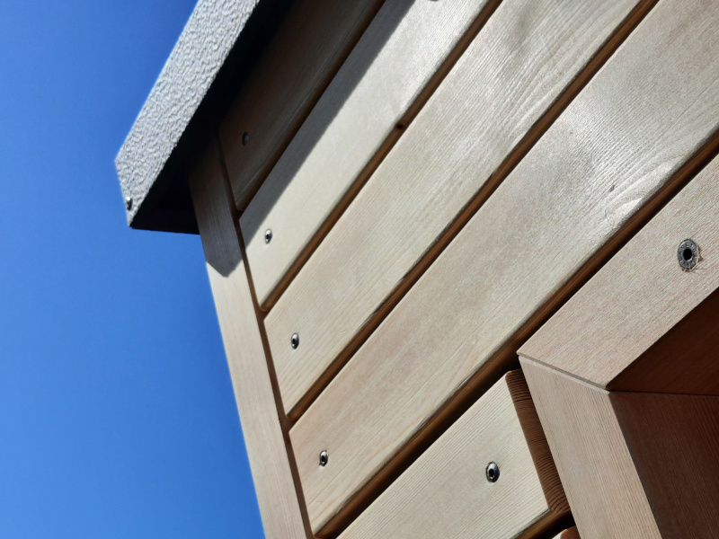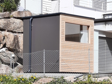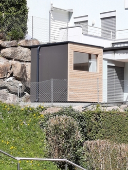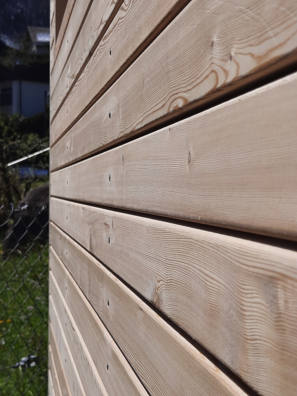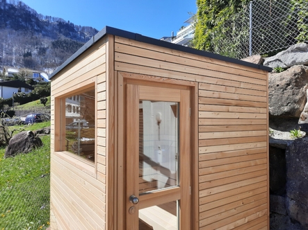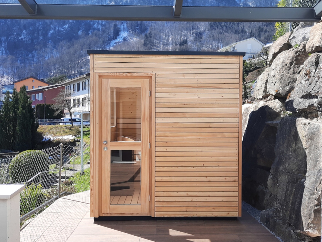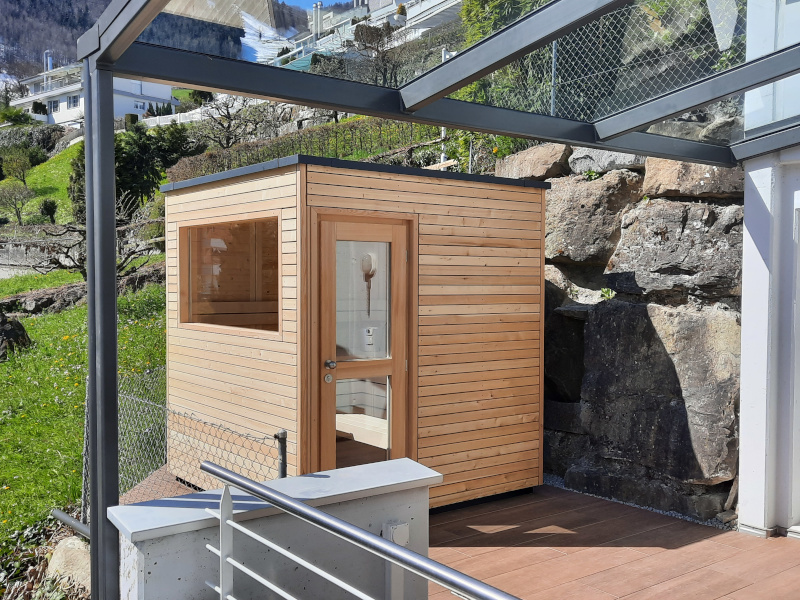 Bei diesem Saunaprojekt, in der Zentralschweiz, wurde vom Kunden eine Aussensauna gewünscht, bei der die Fassade auf der einen Seite – gegen die Terrasse - mit einer Rhomboid- Verkleidung in Lärche, auf der andern Seite – wetterseitig – in einer pflegeleichten Vollkernplatte ausgeführt wurde.
