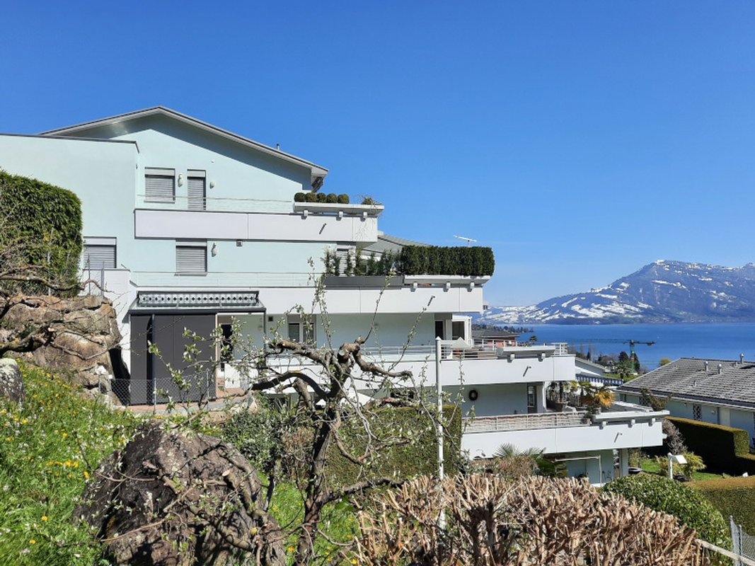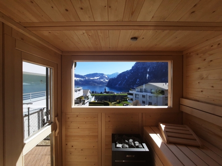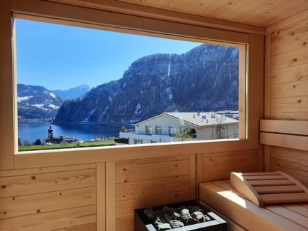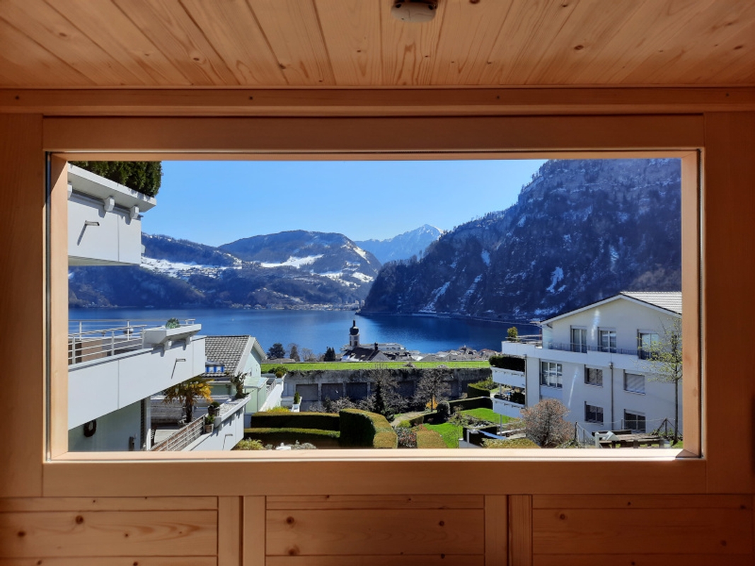 Die Sauna wurde in Massivholzbauweise in nordischer Fichte ausgeführt. Das Panoramafenster ermöglicht den wunderschönen Blick Richtung See. Durch die Anordnung im oberen Bereich, fühlen sich die Saunierenden aber nicht ausgestellt und können die Entspannung in der Gartensauna geniessen.