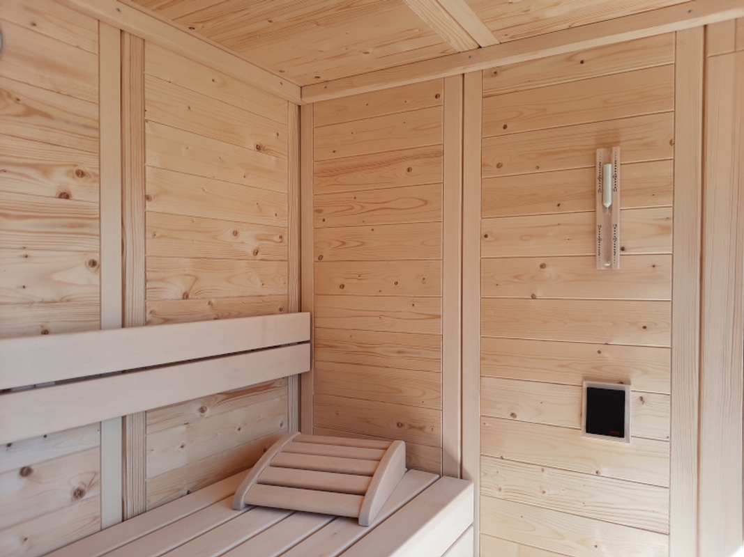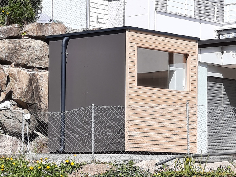 Das gesamte Aussensauna- Projekt, vom isolierten Bodenaufbau über die Saunakonstruktion samt Sauna- Technik, die beiden Fassadenverkleidungen bis hin zur Dacheindeckung und den Blechabschlüssen, wurde alles von der Sauna World aus einer Hand realisiert.