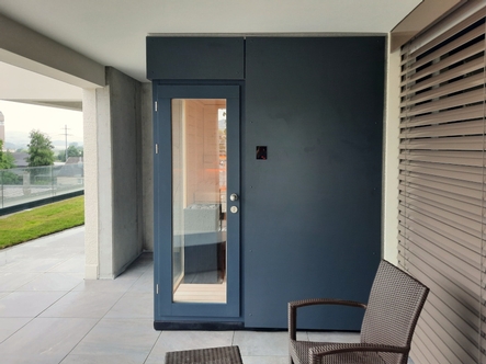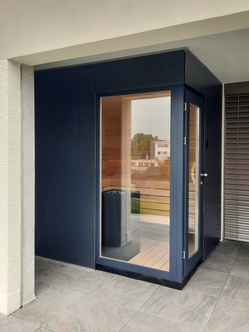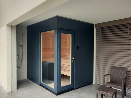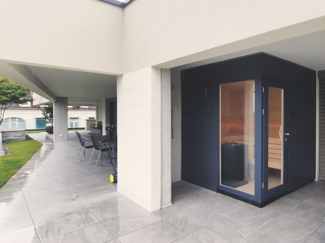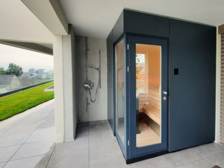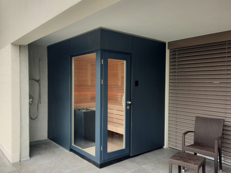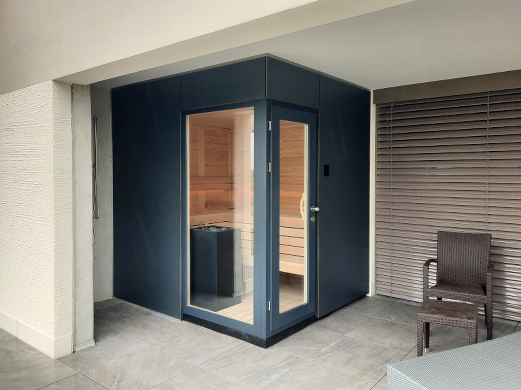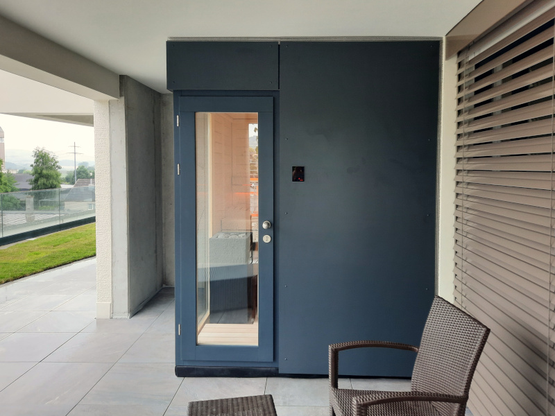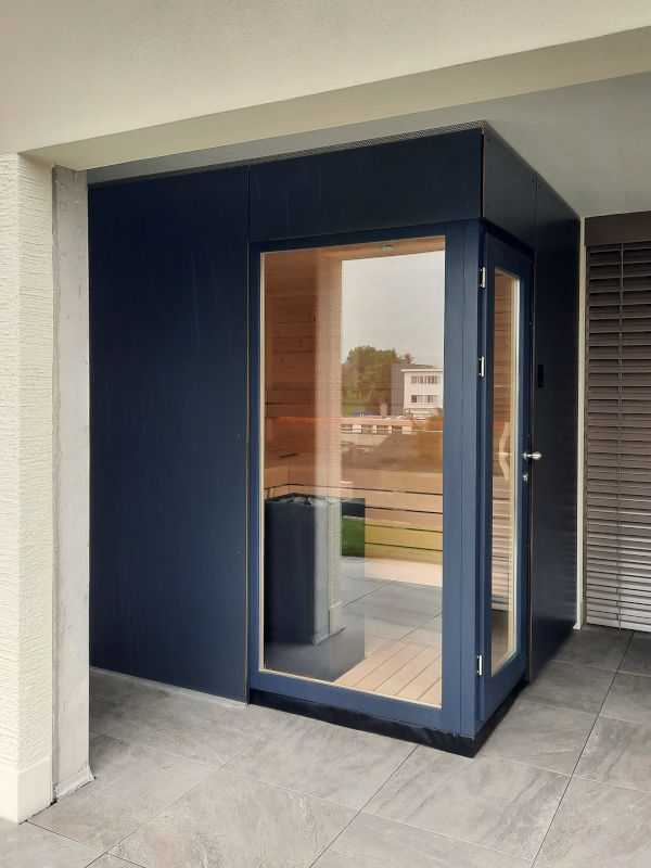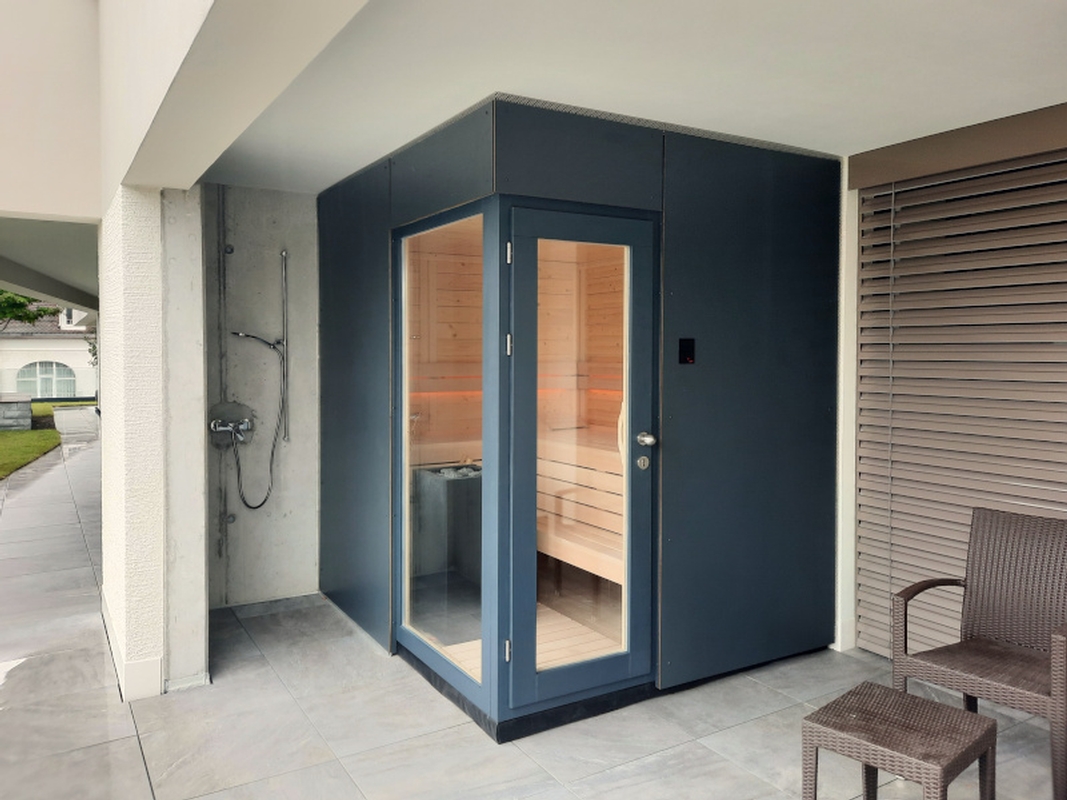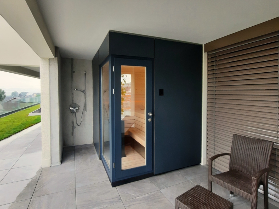Im Rahmen eines Neubauprojektes durften wir diese Aussensauna auf der grosszügigen Terrasse einer Attikawohnung realisieren. Der Wunsch des Kunden war, die Sauna im überdachten Bereich der Terrasse, welcher an die Schlaf- und Sanitärräume grenzt einzubauen. Neben der Sauna waren die Anschlüsse für eine Aussendusche bereits geplant.