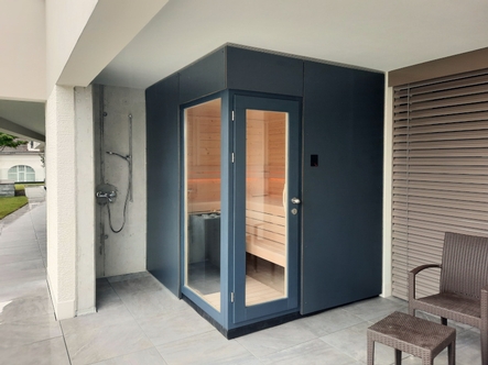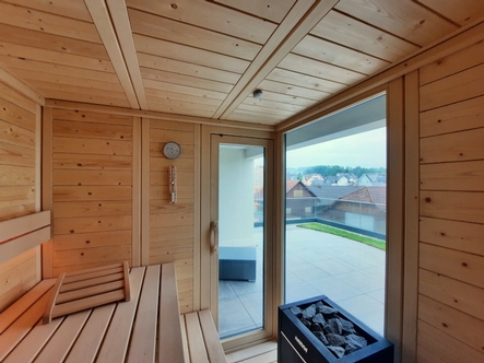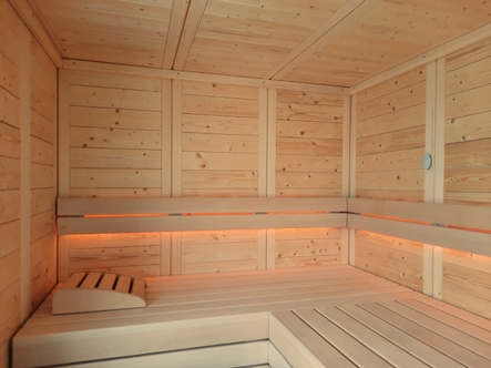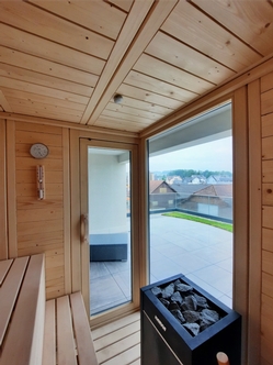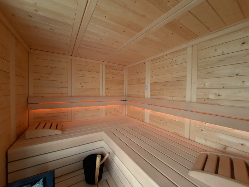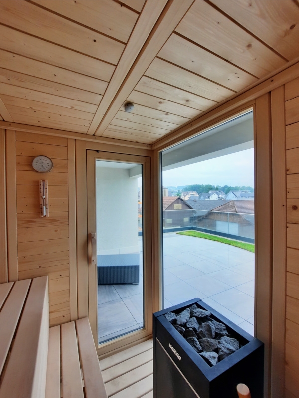 Die Saunakonstruktion ist in nordischer Fichte in Massivholzbauweise ausgeführt und bietet ein einmaliges Saunaklima. Das Panoramafenster und die Saunatür, mit einem grossen Glas, ermöglichen den Blick übers Eck nach draussen.