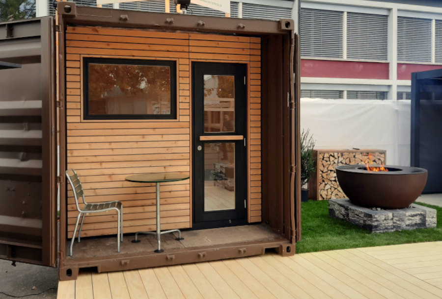 Die Front der Containersauna ist mit einer schönen Lärchenfassade versehen, diese schützt nicht nur vor Witterungseinflüssen, sondern ist auch optisch ein Hingucker. Die Tür ist mit einem Schlüssel abschliessbar. Der Bereich vor der Sauna ist mit einer indirekten Beleuchtung versehen, was die Sauna am Abend schön in Szene setzt.