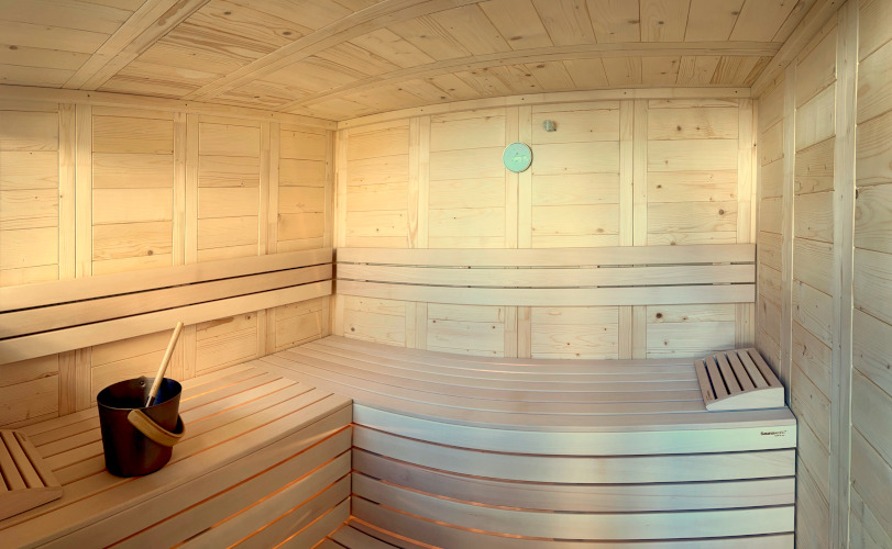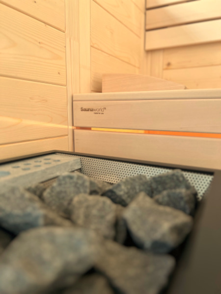 Die Massivholzsauna in Fichte, welche mit einem Bi- O Saunaofen ausgestattet ist misst im Innern 206 x 186 cm (Aussenmass 220 x 200 cm) und bietet Platz für 3 bis 5 Personen. In der Sauna ist eine stimmige, warmweisse Beleuchtung in der Rückenlehne ein stimmiges Ambiente. Das Fenster und der Verglasung in der Tür ermöglicht den Blich nach draussen. Die Türen des Containers können dabei bei Bedarf auch als Sichtschutz eingesetzt werden.