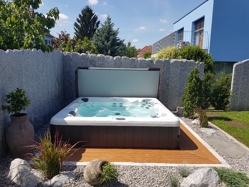 Lassen Sie Ihren Whirlpool Spa zum Teil oder gänzlich in den Fussboden ein, erleichtert das den Einstieg und unterstreicht den Eindruck einer natürlichen Oase. Glatte Stein- oder Holzoberflächen und Kies eignen sich zur Einbettung, da so kaum Gras und Schmutz in das Wasser getragen werden. Wer seinen Jacuzzi frei im Garten platziert, sollte ausserdem an Sichtschutz und Fussbodenplatten zum Haus denken. So können Sie und Ihre Gäste sauber und leichtfüssig ins entspannende Bad steigen.