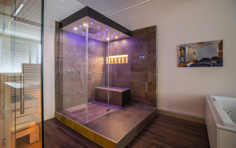 In der wasserdichten Verkleidung der Dampfdusche lässt sich nahezu jedes Extra einbauen: Von einer Musikanlage mit in der Wand integriertem Display über verschiedenfarbige Lichteffekte bis hin zu verschiedenen Duschfunktionen wie Regendusche, kühler Sprühnebel und Massage-Duschkopf verfügt die handgebaute Dampfdusche über alle Funktionen, die das Duschen angenehmer machen. In der Kabine ist Platz für zwei Personen – geniessen Sie die Regendusche im Stehen oder kühlen Sie sich auf der integrierten Sitzbank ab. So können die Bewohner des Hauses das Duscherlebnis individuell anpassen und jedem Tag eine neue Form der Entspannung ausprobieren.