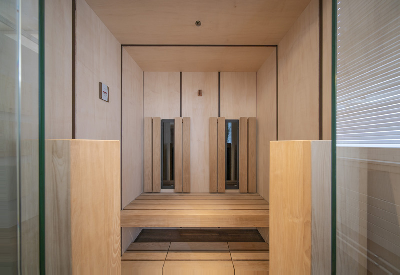 Die grossflächigen Ahorn-Paneele, unterbrochen von eleganten, dunklen Federn, vermitteln eine hochwertige Optik. Das unterstreichen auch die Bank, die beiden Türme und die Rückenlehnen in thermobehandelter Espe. Jeder der beiden Türme beherbergt je einen Infrarot-Vollspektrumstrahler. Der symmetrische Aufbau der Kabine sorgt für ein ruhiges, harmonisches Bild. Abgerundet wird der stimmige Gesamteindruck durch grosszügige Glasfronten. Das vermittelt Transparenz und Offenheit und sorgt innerhalb der Kabine für ein angenehmes Raumgefühl.