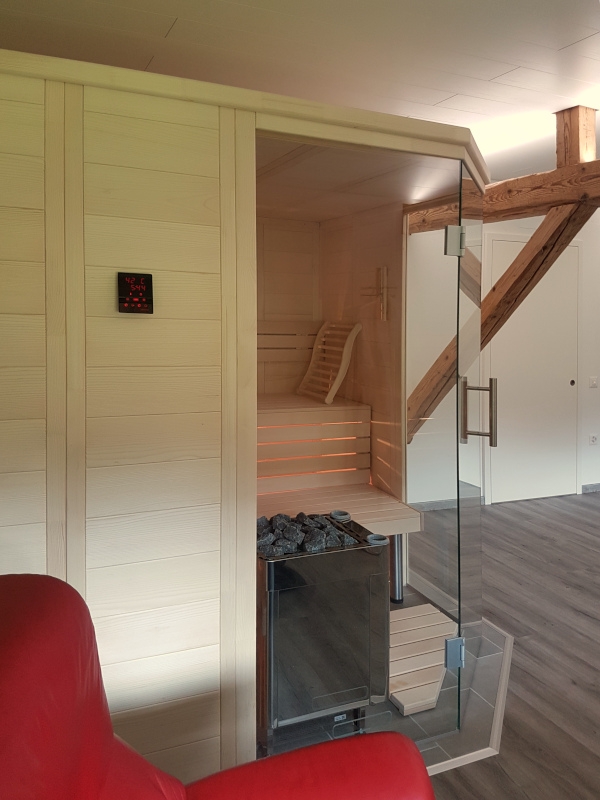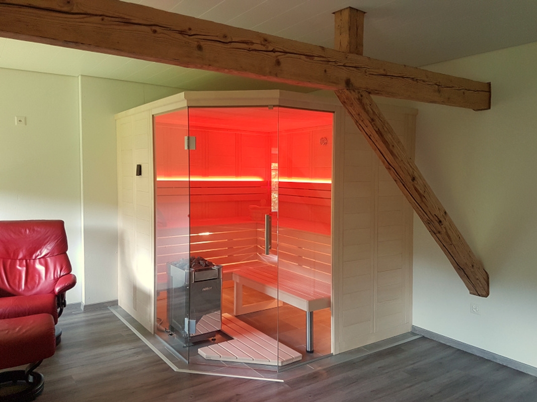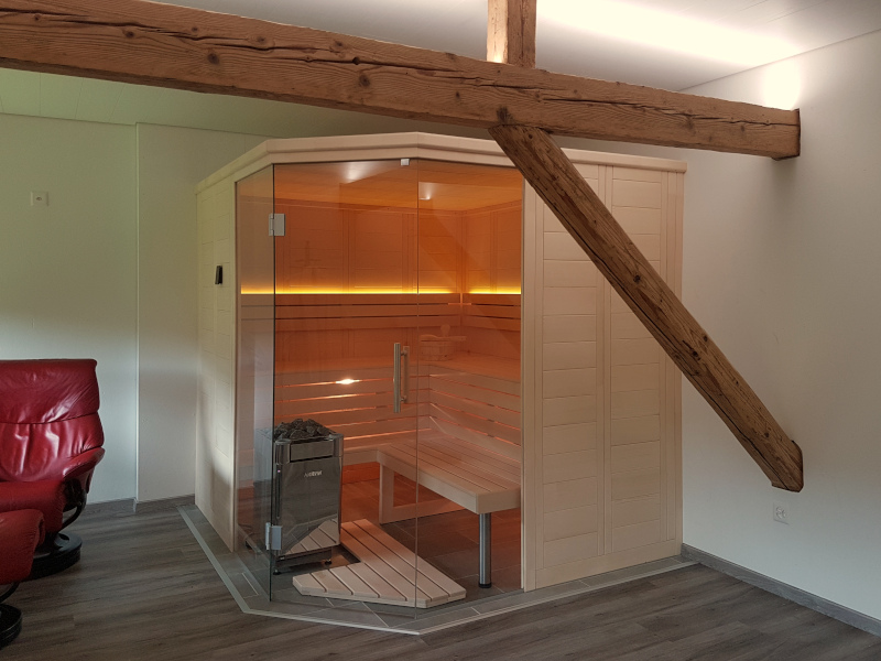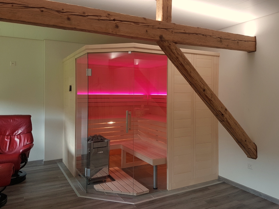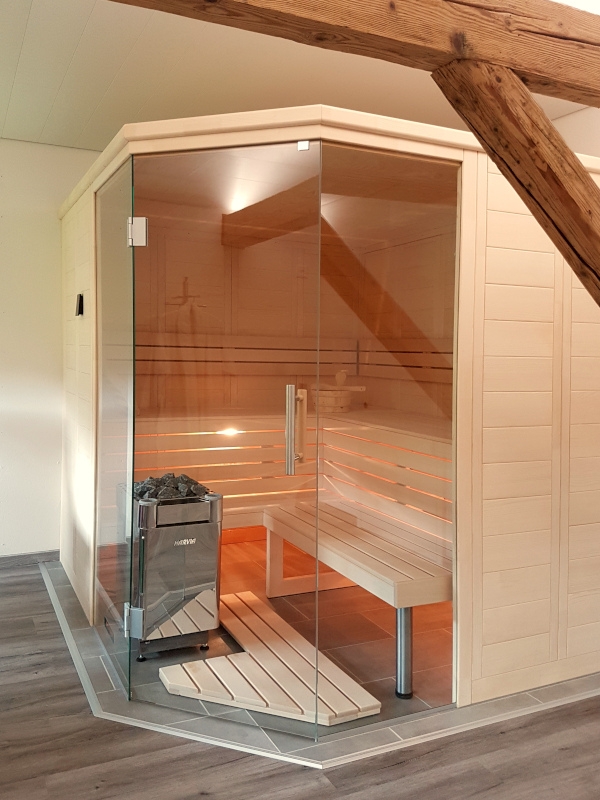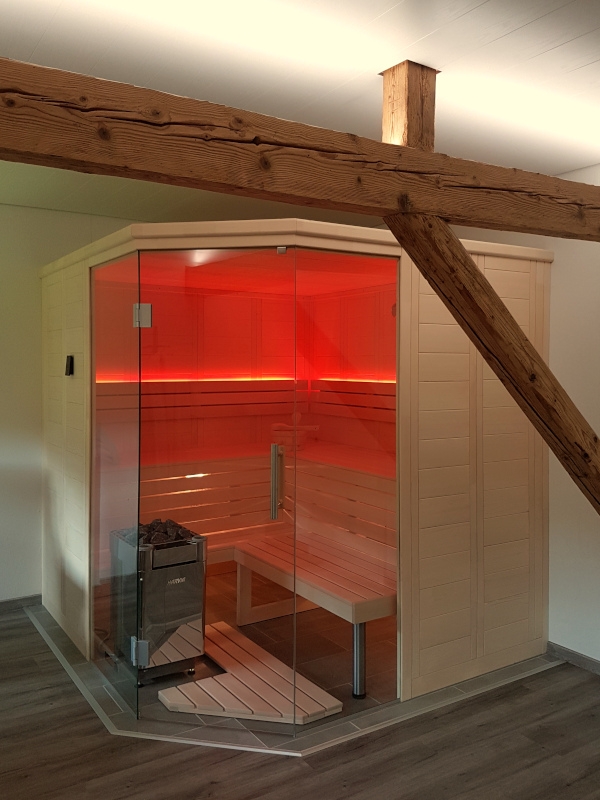 Diese Sauna wurde mit einer abgeschrägten Glasecke ausgeführt, was die Aussicht nach draussen ermöglicht, aber auch von aussen den Blich ins Innere der Sauna zulässt. Die beiden Sauna- Beleuchtungen – Farblicht in der Rückenlehne und warmweisse Saunabeleuchtung unter den Bänken – ermöglichen es ein individuelles und vielseitiges Ambiente zu wählen.