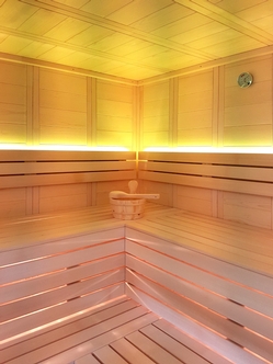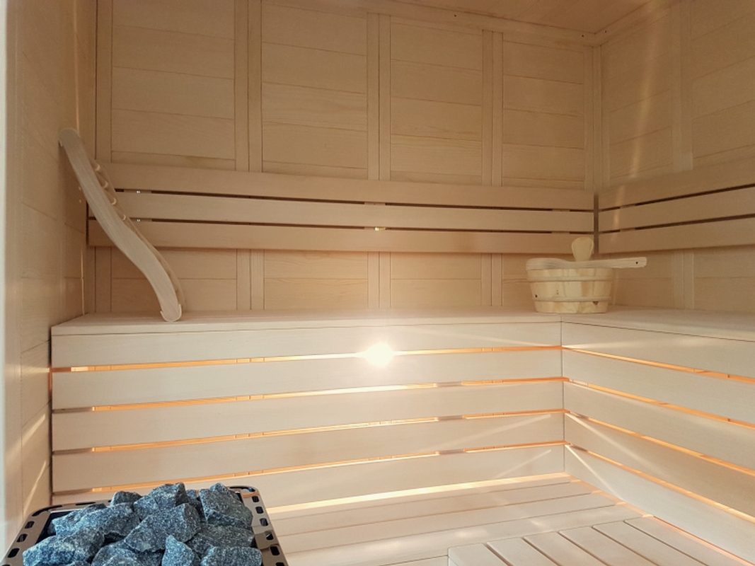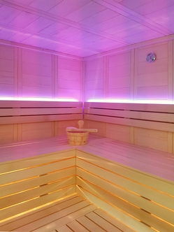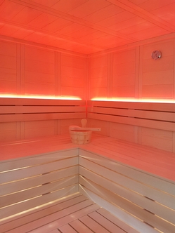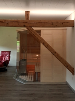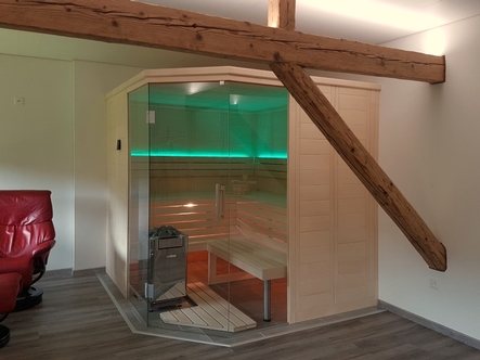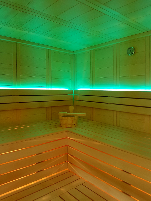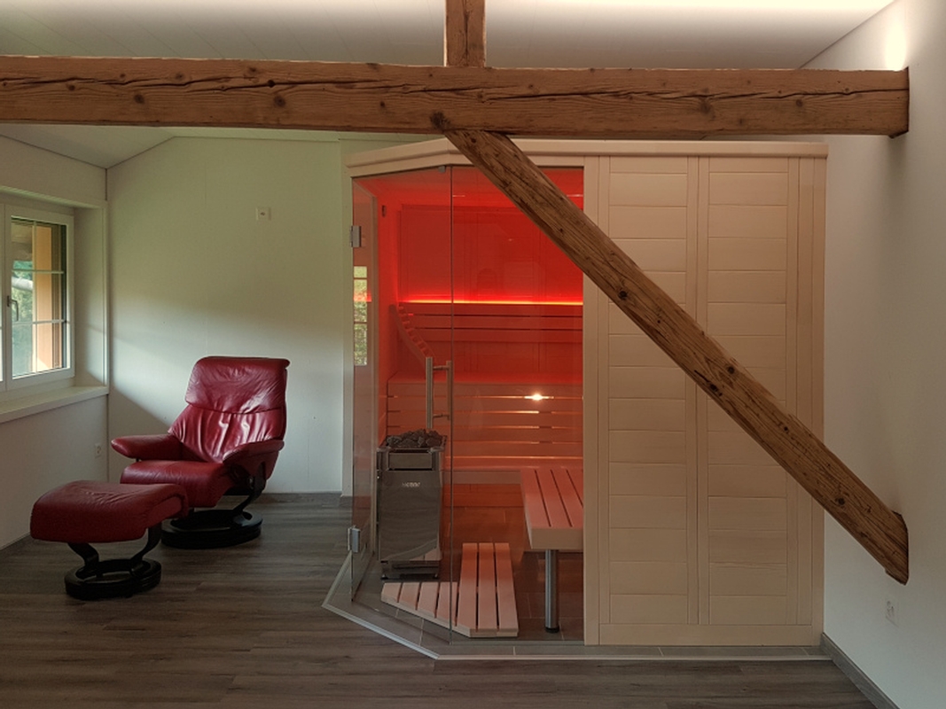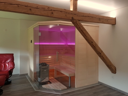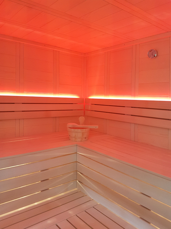 Diese Sauna wurde mit einer abgeschrägten Glasecke ausgeführt, was die Aussicht nach draussen ermöglicht, aber auch von aussen den Blich ins Innere der Sauna zulässt. Die beiden Sauna- Beleuchtungen – Farblicht in der Rückenlehne und warmweisse Saunabeleuchtung unter den Bänken – ermöglichen es ein individuelles und vielseitiges Ambiente zu wählen.