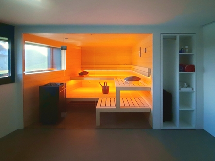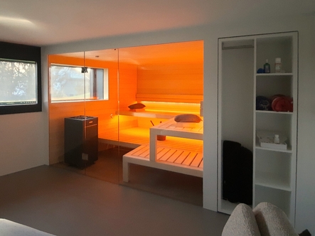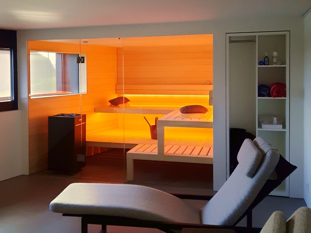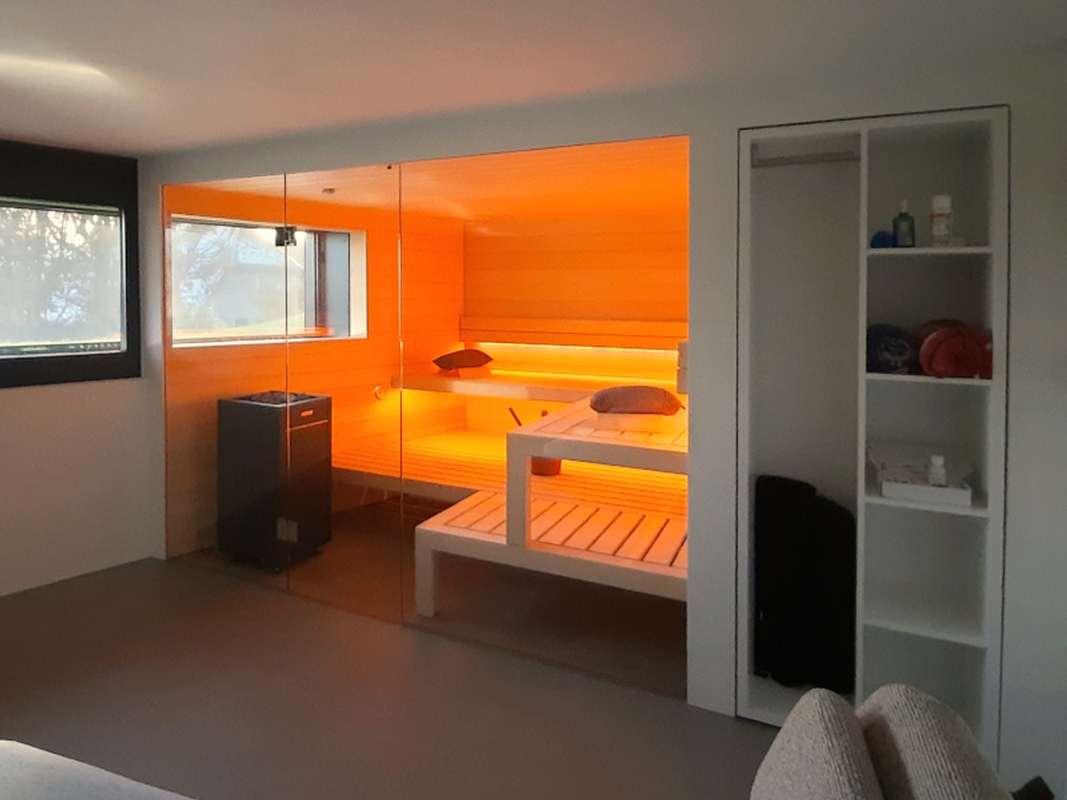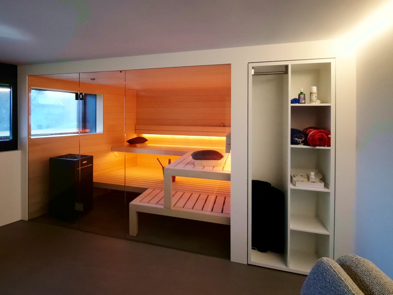 Im Rahmen der Gesamtsanierung und Erweiterung eines Einfamilienhauses wurde im Sous- Terrain der alte Keller zum Wellnessraum ausgebaut. Die Sauna wurde der Form des Raumes, mit einer schrägen Wand, angepasst. Der Wunsch der Bauherrschaft – ein Fenster in die Sauna zu integrieren, damit der Blick nach draussen möglich wird – wurde so umgesetzt. Die Front der Sauna ist, wie die angrenzenden Wände auch, in einem weissen Putz gehalten. Durch diese Ausführung und die grosse Glasfront der Sauna wirkt die Sauna von aussen betrachtet wie ein integriertes Bild.