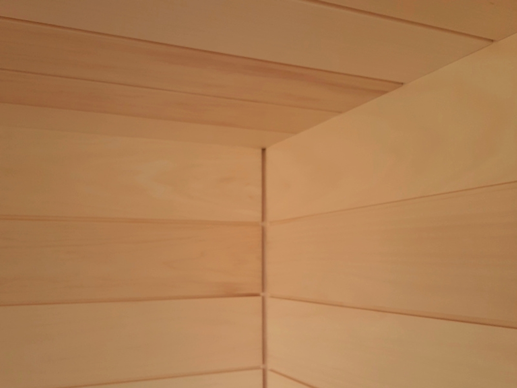 Um das moderne, schlichte Design des Raumes zu übernehmen wurde die Sauna innen mit einem scharfkantigen Breit- Profil in hellem Espen- Holz ausgeführt. Die horizontale Verlegeweise des Saunaholzes trägt ebenfalls zum modernen Look bei.