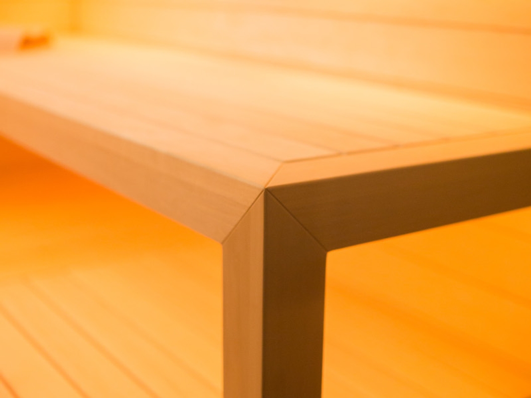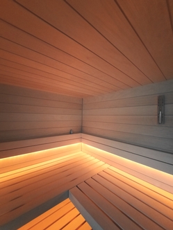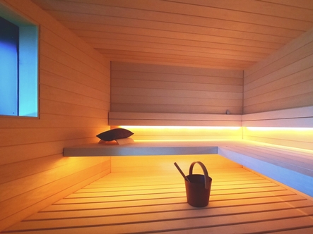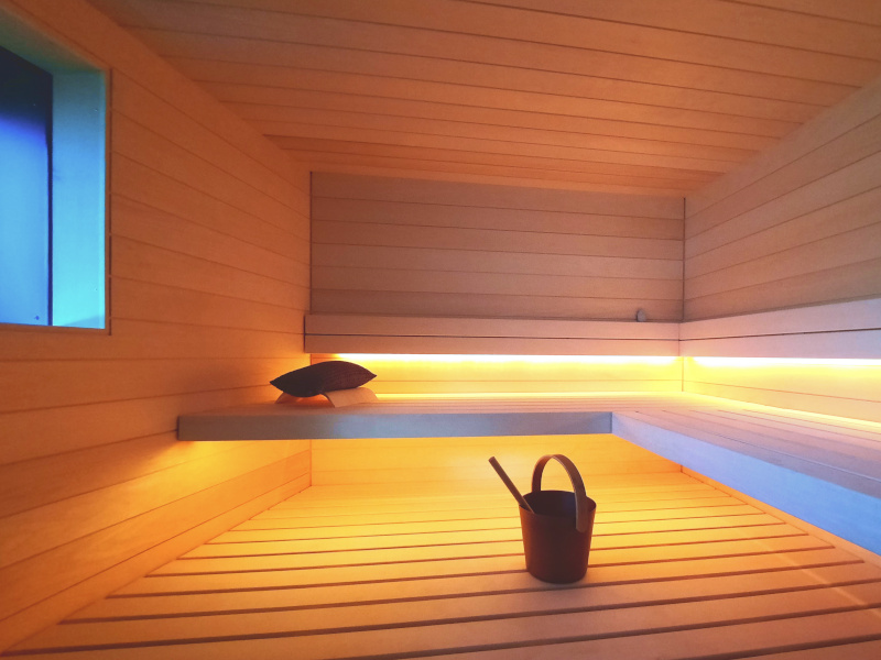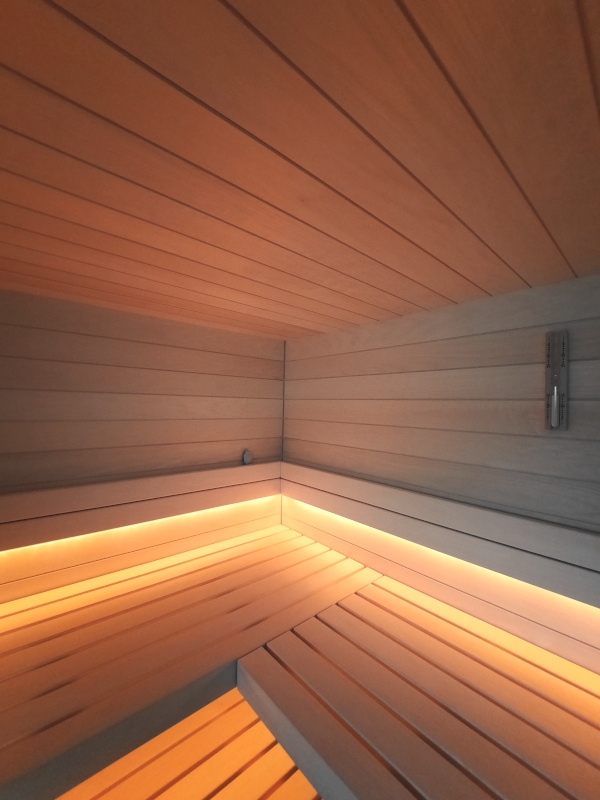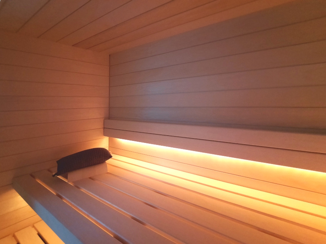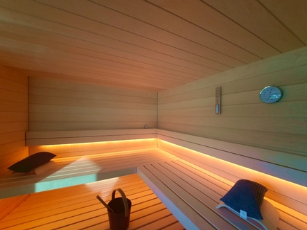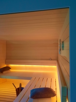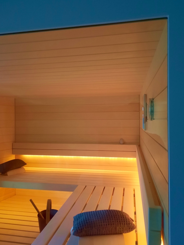 Die warmweisse Saunabeleuchtung hinter den Rückenlehnen und unter der oberen Bank sorgen für ein wohliges Ambiente.