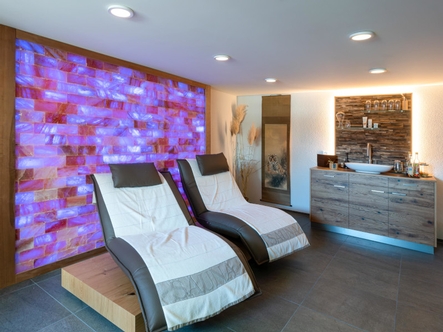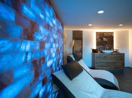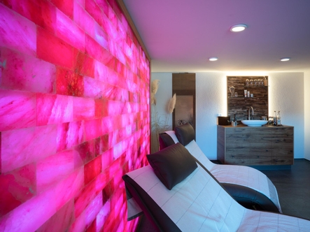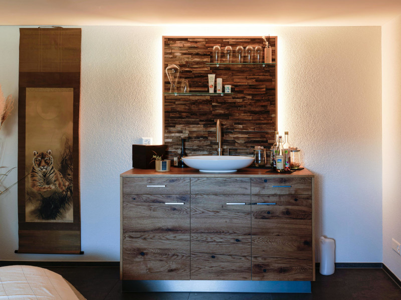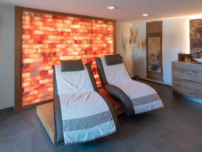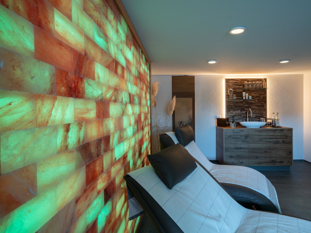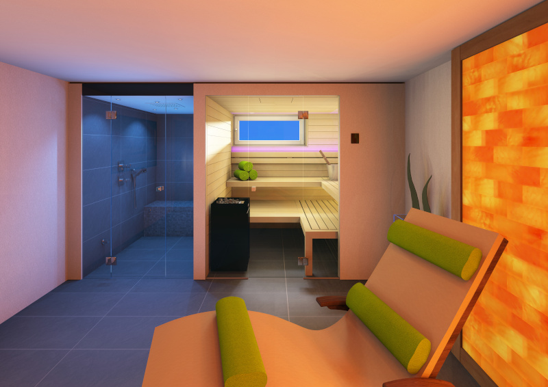 In einem ersten Schritt wurde zusammen mit der Bauherrschaft ein Raumkonzept mit der entsprechenden Wellnesselementen entwickelt. Aufgrund der Wasserinstallationen, welche sich im Nebenraum befanden, war die Position der Dampfdusche gegeben. Gleich daneben wurde die Sauna geplant, mit der Herausforderung, das bestehende Fenster in die Sauna zu integrieren. Die Sauna und die Dampfdusche wurden so geplant, dass sie durch die verbindende Front optisch als Einheit wirken. Das optische Highlight des Raumes ist die beleuchtete Salzsteinwand, welche dem Raum zusammen mit den passenden Farb- und Beleuchtungskonzept einen entspannenden Wellnesscharakter verleihen. Die Wellnessliegen, ein TV und die beleuchtete Teeküche runden den das Konzept des Wellnessraumes ab.