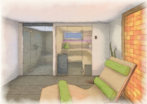 Der Wunsch der Bauherrschaft war eine Wellnessoase in ihrem bestehenden Heim zu erstellen. Dafür vorgesehen war der mittlerweile ungenutzte Bastel-/ und Spielraum mit rund 40m2 im Untergeschoss. Sauna, Dampfdusche, Ruheecke mit Fernseher sowie eine Teeküche waren die Vorgaben, welche zwingend integriert werden mussten.