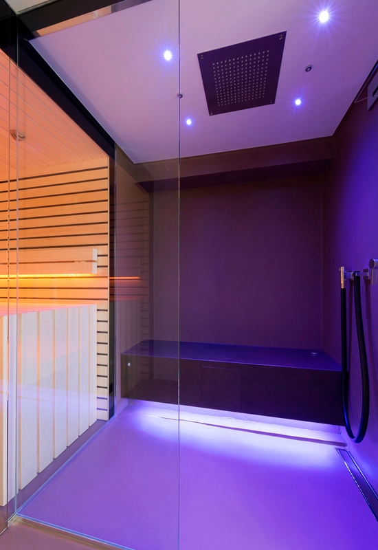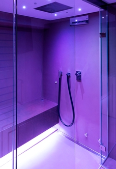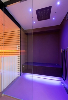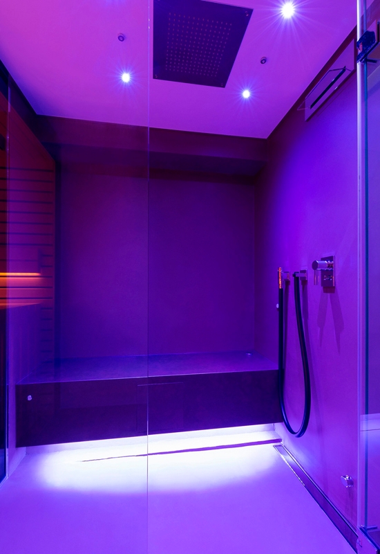 Bauherrschaft geniesst das Dampfbad, welches mit einer Regenbrause, Schwalldusche auch als Dusche genutzt wird. Ausgestattet ist die Dampfdusche zusätzlich mit Soundsystem, Sitzheizung, Farblicht und Sprühnebeldüsen. Durch die Verwendung von hochwertigen Komponenten steht das Dampfbad bereits nach 10 Minuten zum entspannen bereit und das Dampfbild bleibt während der gesamten Nutzung gleichmässig bestehen.