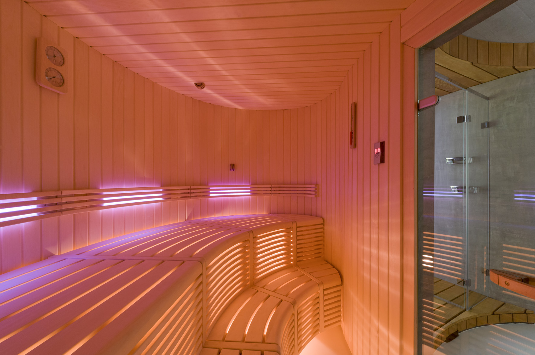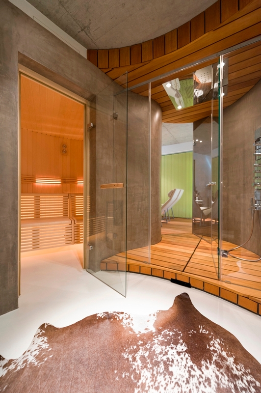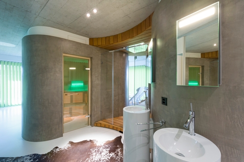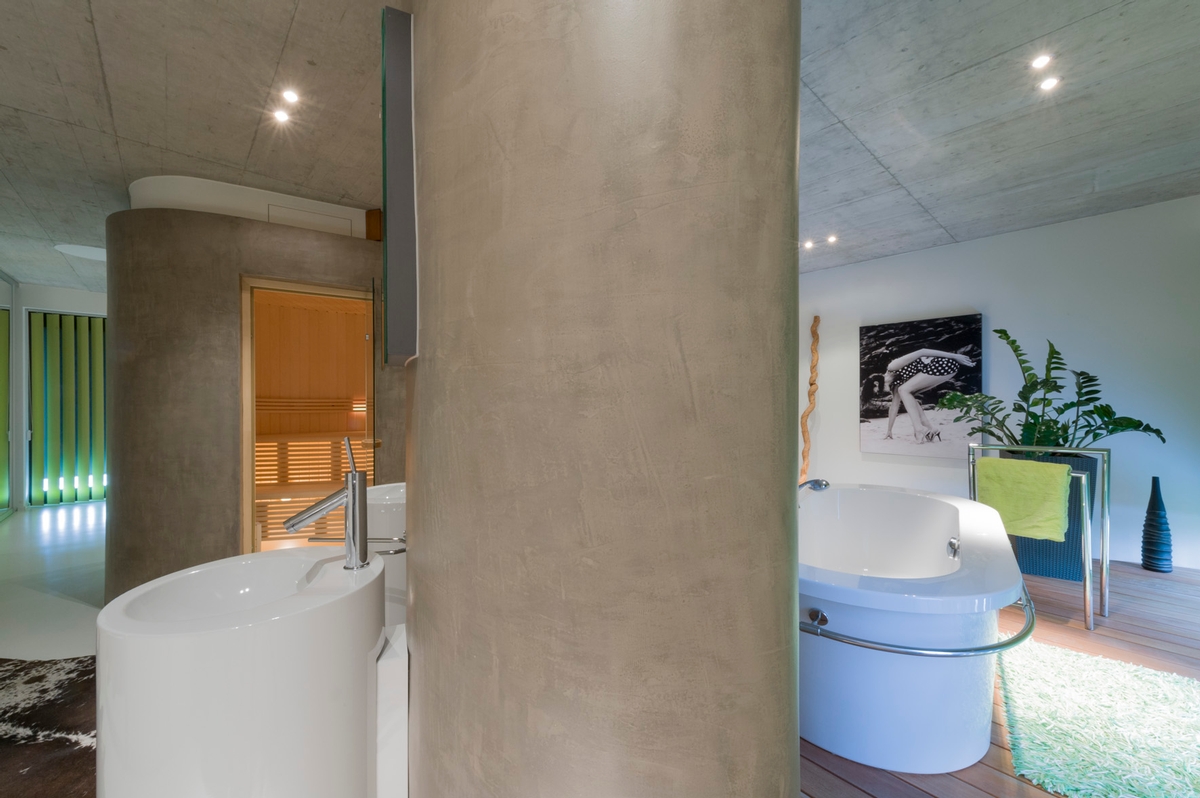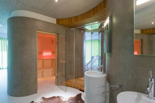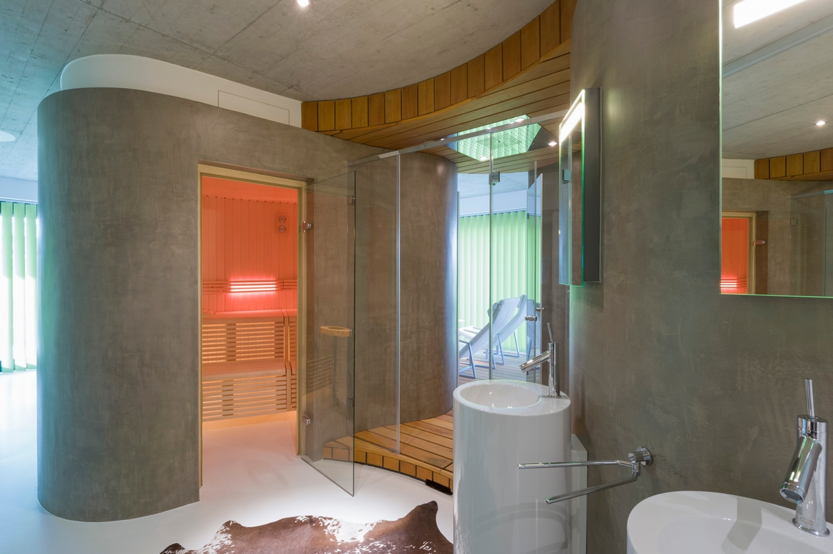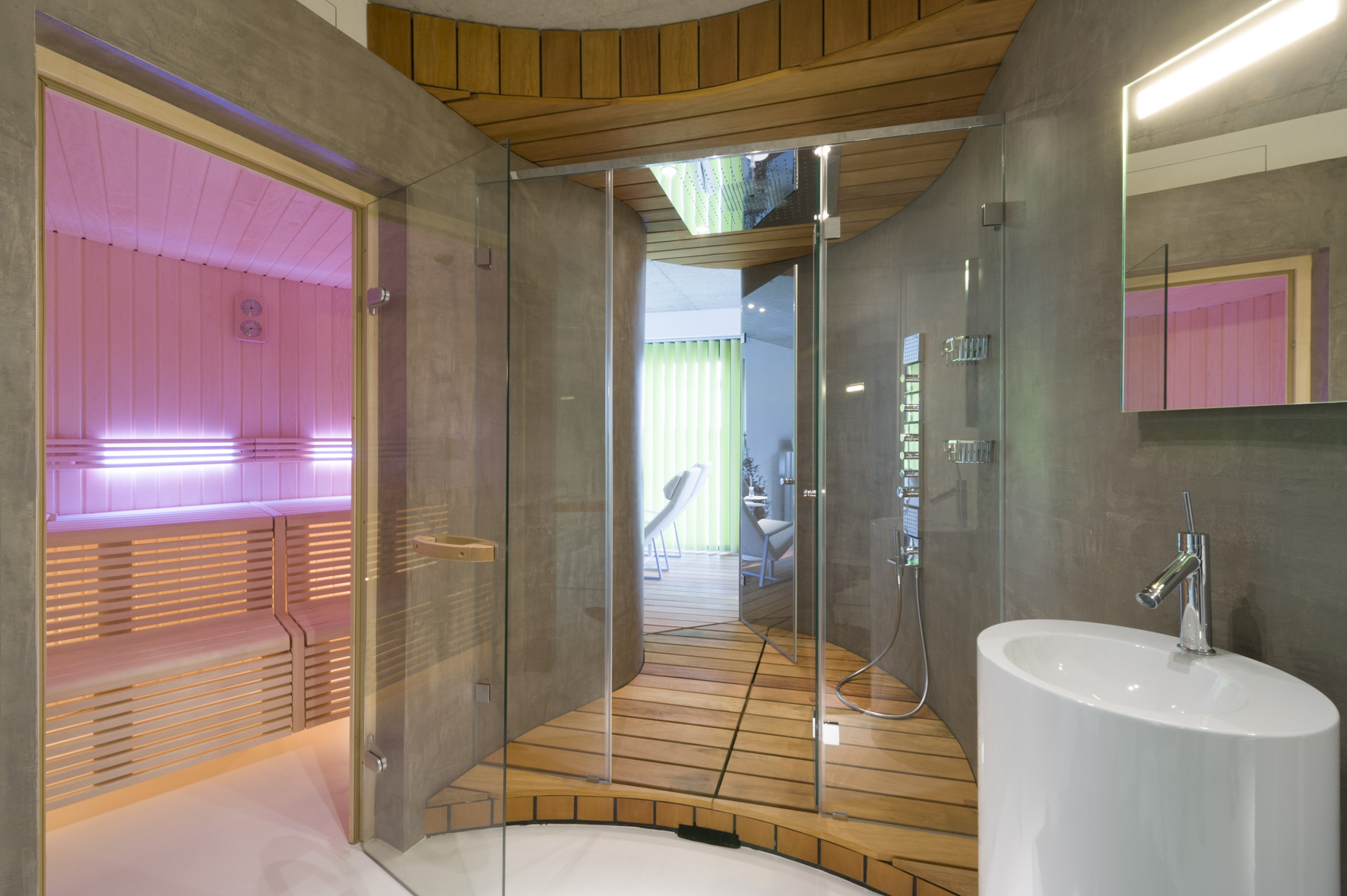 Konsequent schlicht und dennoch mit einigen Extras, so präsentiert sich dieser organisch geformte Bereich von der Saunakabine über den Duschbereich.