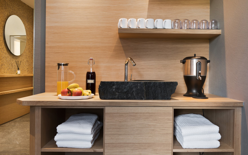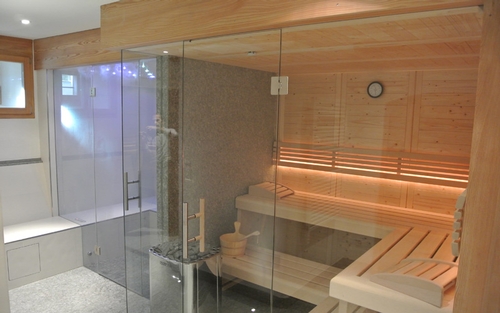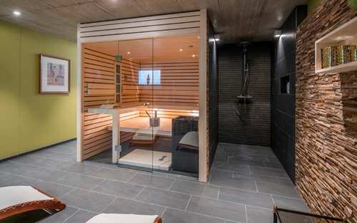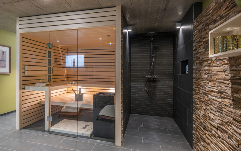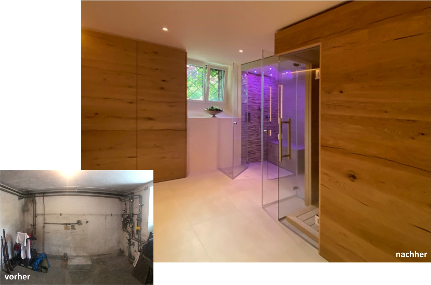 Die eigene Wellnessoase in einem der Kellerräume, das war der Wunsch der Bauherrschaft. Herzstück des Raumes sollte die Sauna sein, aber auch ein Erfrischungsbereich mit sowie die Möglichkeit zu Liegen standen auf der Wunschliste.