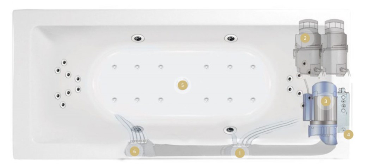 Nach dem Ablassen des Badewassers werden das gesamte Leitungssystem und die Düsen mit frischem Wasser gespült. Dadurch werden Schaum- und Hautreste sowie Haare nahezu vollständig ausgespült. Das Leitungssystem läuft automatisch annähernd vollständig leer. Fast kein Restwasser, kein anfälliger Restwasserkolben! Jetzt setzt automatisch die Trockenblasautomatik ein. Letzte Wassertropfen, die physikalisch nicht abgelaufen sind werden ausgeblasen bzw. ausgesaugt.